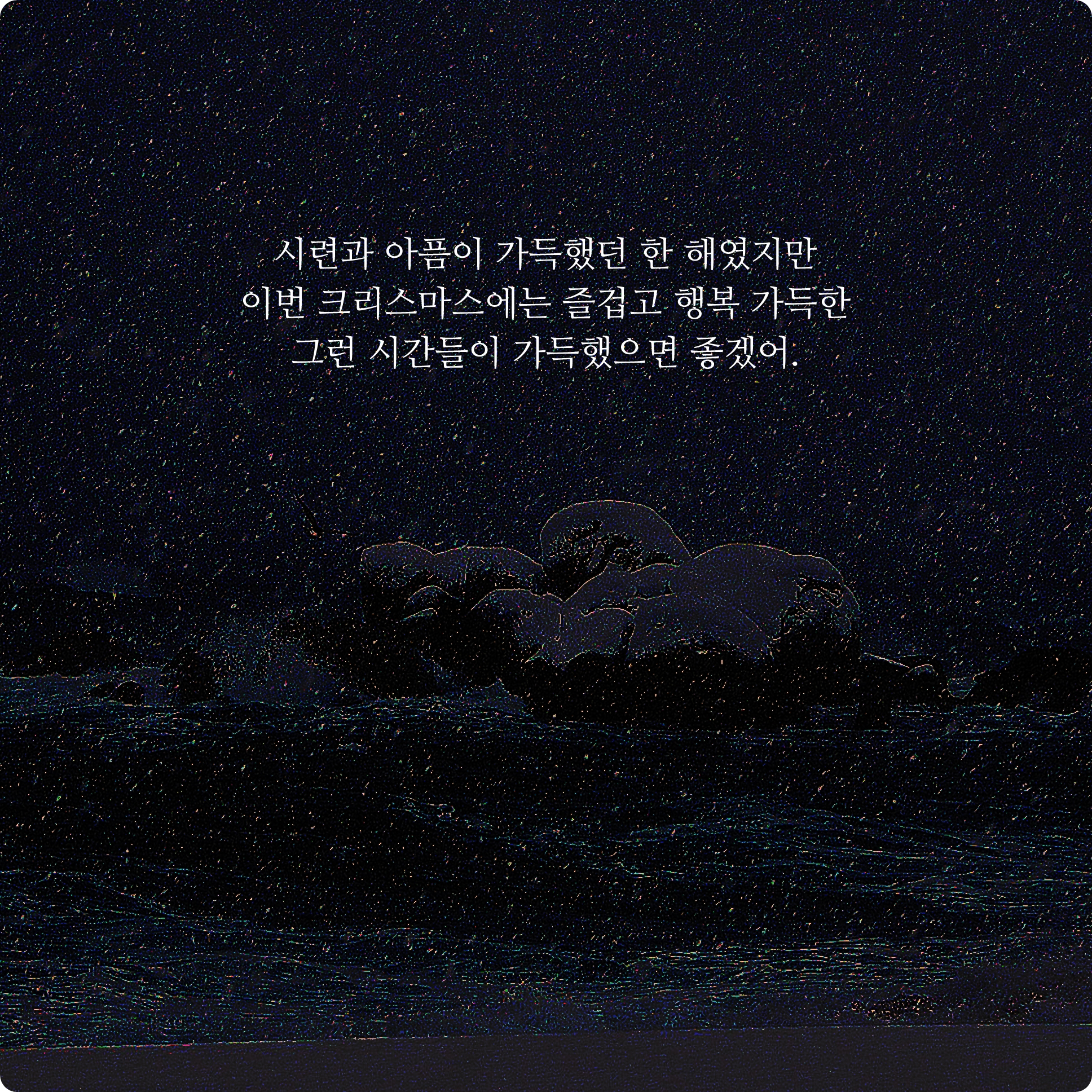 크리스마스의 대표적인 감정은 바로 행복 그리고 즐거움과 기쁨이 아닐까 싶어요. 하지만 지났던 한 해를 되돌아보면 그렇지 못했던.. 여러 고난과 어려움의 한 해였던 것 같습니다. 그래서 앞으로의 다가올 날들 그리고 내가 바라는 날들에 대한 행복한 날들을 '크리스마스'로 상징적으로 표현하였습니다.