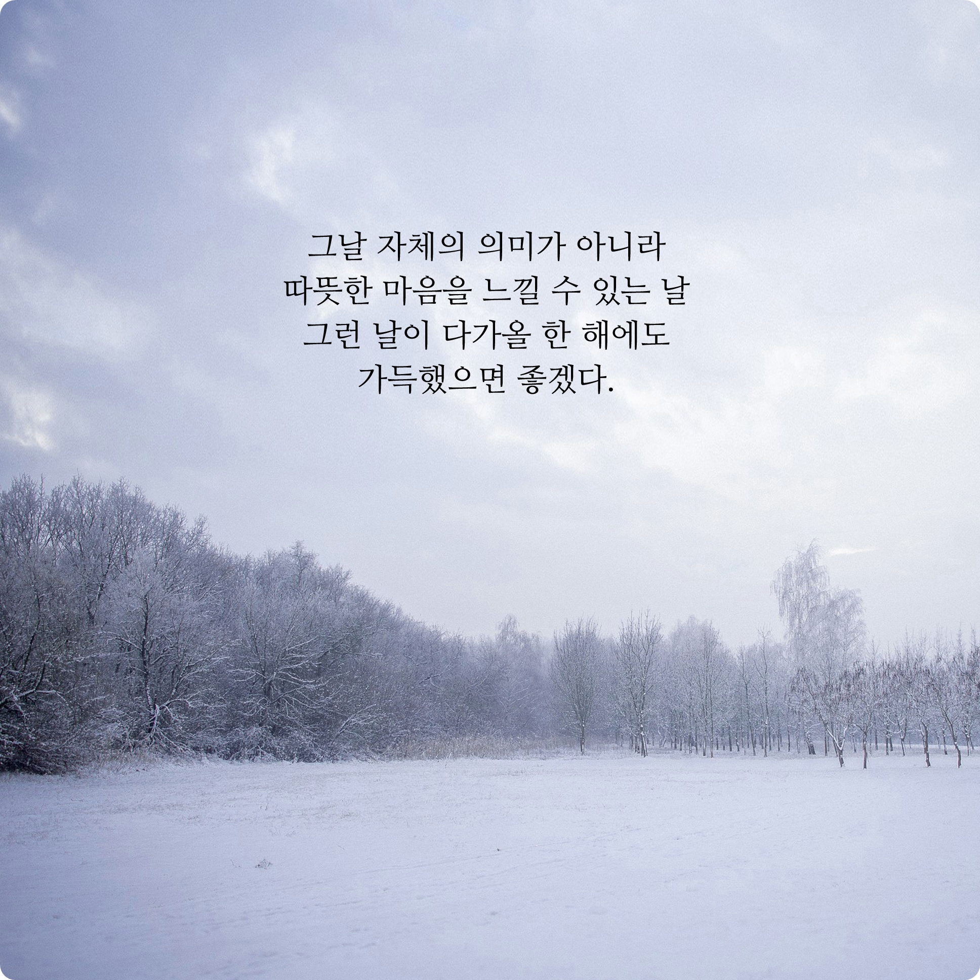 특별한 행복이 가득한 날이기 때문에? 의미있는 날이기 때문에? 따뜻한 마음이라는 것은 늘 내 안에 간직하고 있었습니다. 그것을 모른채 특별한 상황이나 의미가 있는 하루를 쫓으며 그런 의미를 찾으려고 하는 것 같네요. 늘 마음속에 간직하고 있는 희밍이라는 것이 다가올 한 해에도 1년 내내 가득했으면 좋겠습니다. 저는 수십번의 실패 투성이지만 마음속에 희망을 간직하고 있기 때문에 포기하지는 않으려고 합니다. 실패한 것은 포기가 아니거든요. 진짜 포기한 것이 실패한 것이기 때문이죠.