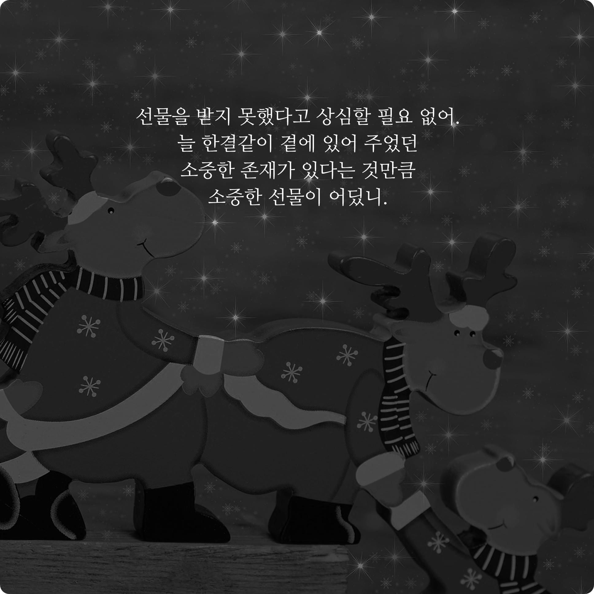 크리스마스이기 때문에 행복한 날이 되는 것은 아니야. 본질적인 행복은 언제나 마음에 있지. 다가올 한 해를 크리스마스처럼 행복과 축복이 가득한 그런 해가 되었으면 해.