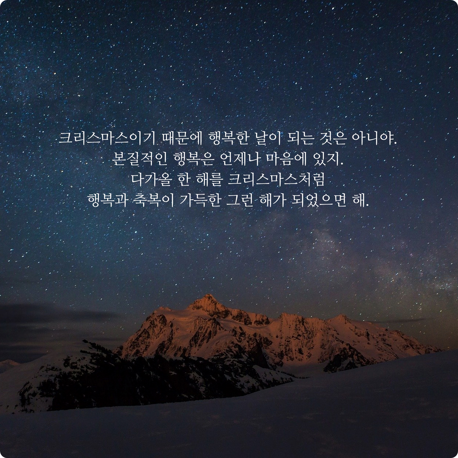 성탄절에 읽기 좋은 글귀 및 짧은 시를 모음으로 만들었습니다. 모두 무료로 저장이 가능한 직접 작성한 글입니다. 저는 이상하게 연말이 되거나 크리스마스가 되면 저만의 감성에 빠져있는 경우가 많아요. 한 해를 정리하는 시기이기도 하지만 행복과 축복이 가득한 날이기도 하기 때문에 기쁨과 아쉬움의 중첩에서 마음이 뒤숭숭해지는 그런 때가 아닌 것 같습니다. 그래도 부정을 긍정으로 좌절을 희망으로 전환시킬 수 있는 또 한 번의 새로운 한 해를 위한 마음 가짐이 필요한 시점이 아닌가 싶습니다.