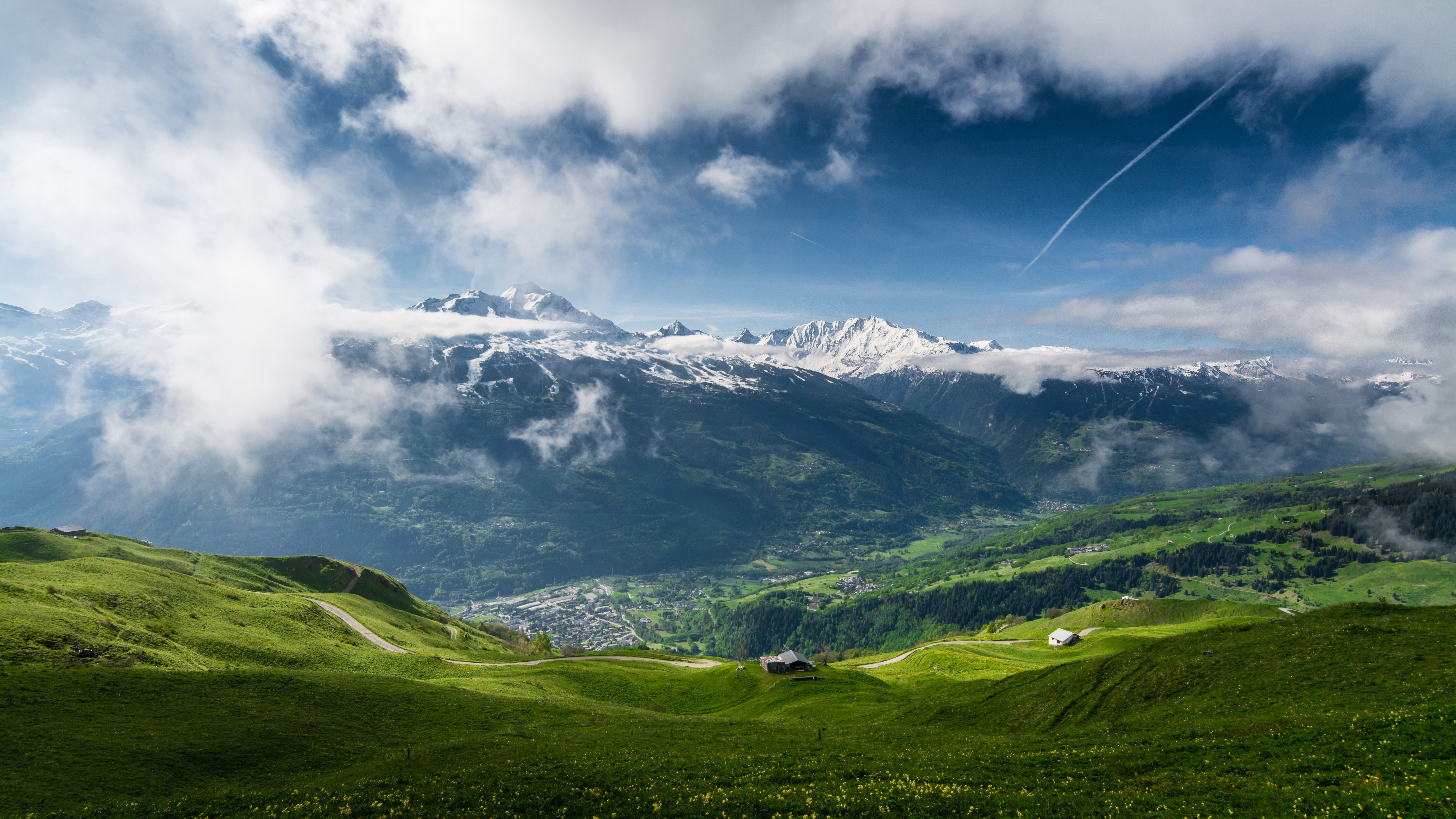 푸르른 녹음과 들판과 어우러져있는 저 멀리 눈덮인 산이 보이는 이미지입니다. 이런 풍경이 개인적으로 예쁜 것 같아요. 깨끗함을 느껴주는 동시에 광활한 설경의 자연경관이 같이 담겨져 있습니다.