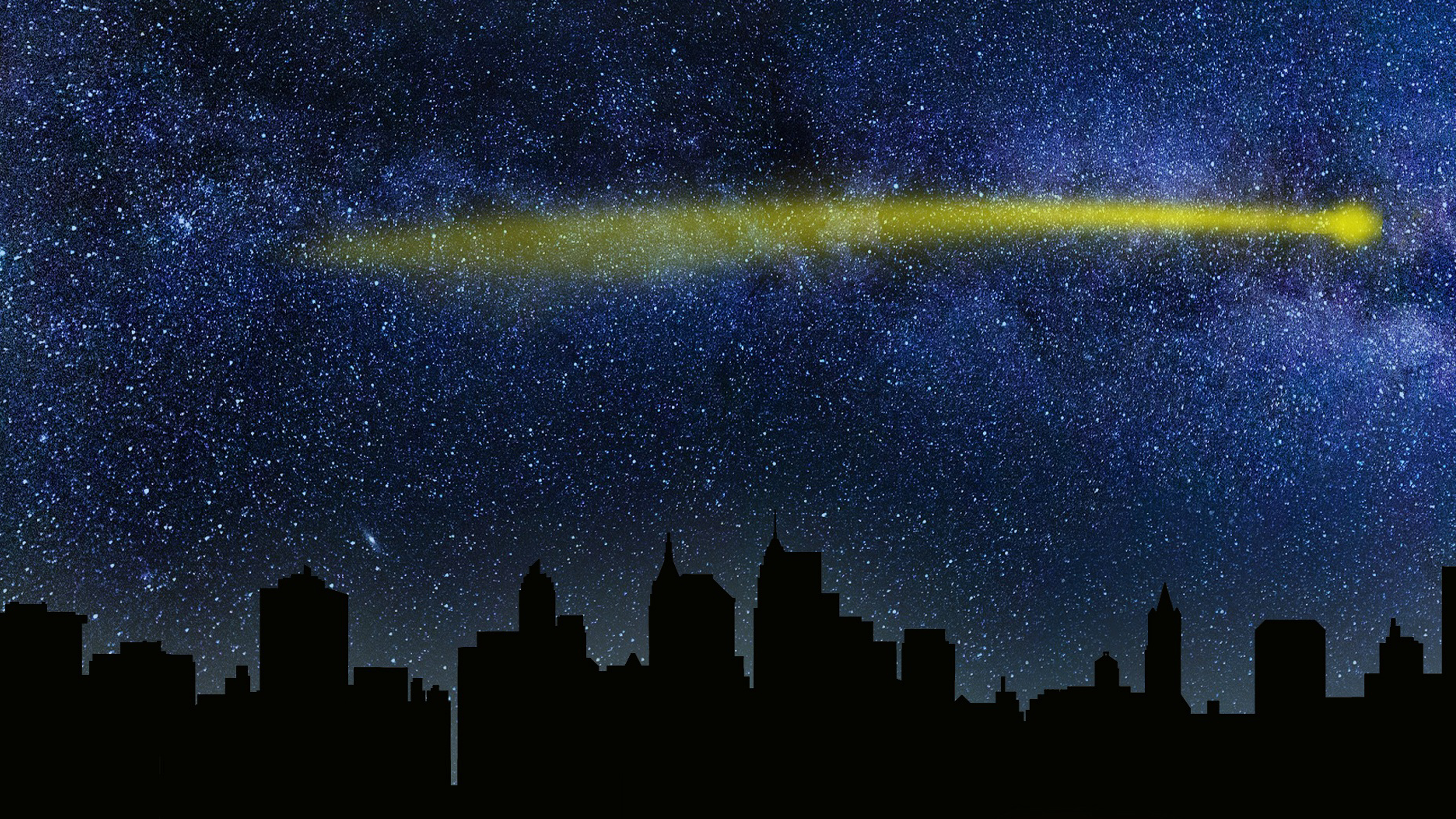 이것은 사진이 아닌 클립아트형 이미지입니다. 별이 가득한 밤에 도심의 건물 위로 노란빛이 오른쪽으로 날아가고 있는 듯한 모습입니다.