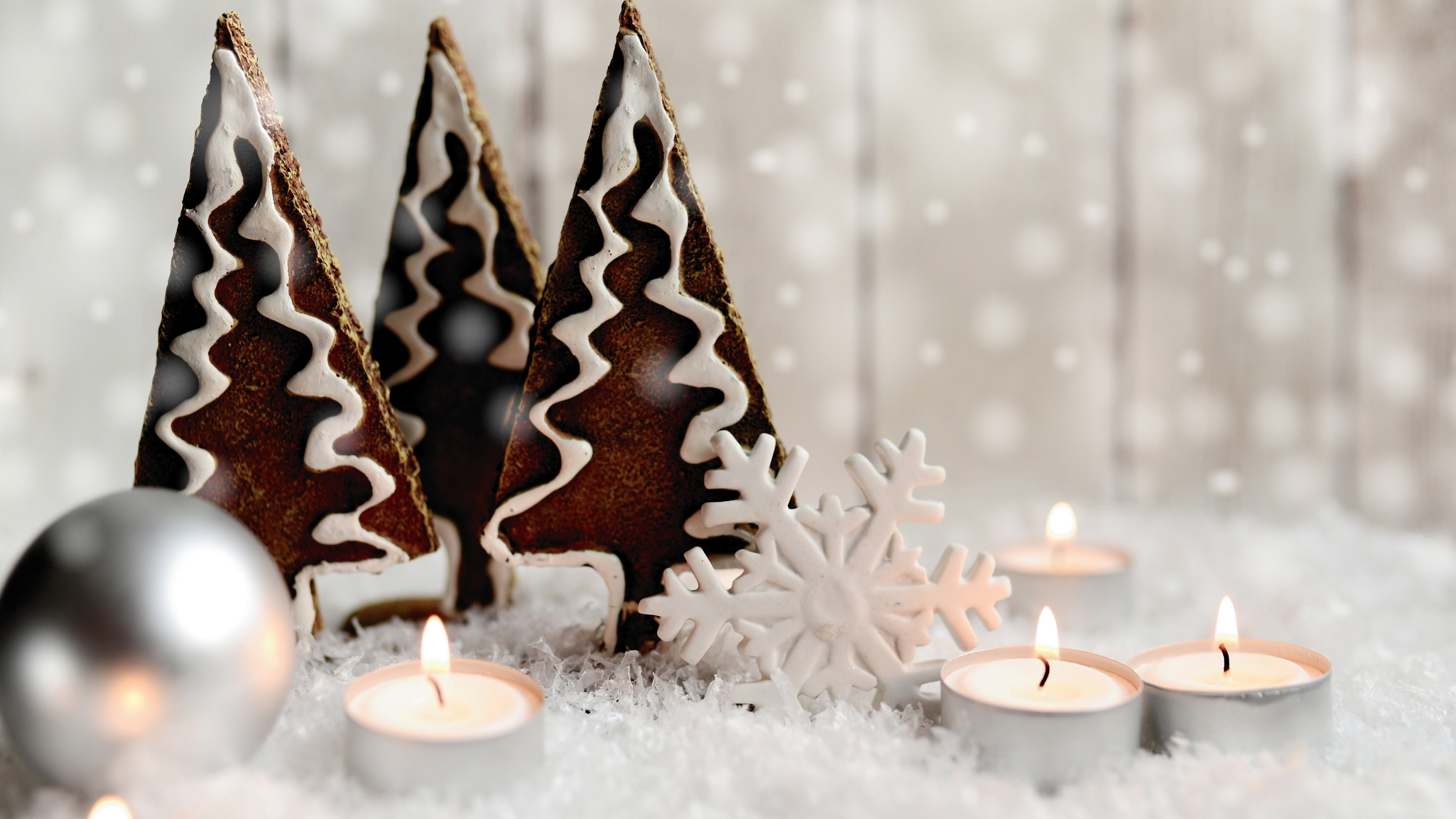 다음은 촛불과 눈꽃모양의 장식 그리고 초콜릿처럼 보이는 삼각형의 트리모양의 장식도 있구요. 그 뒤로는 흰눈이 사방으로 내리고 있는 풍경과 함께 그 뒤로 목재의 합판 울타리가 보이는 배경을 하고 있는 모습입니다.
