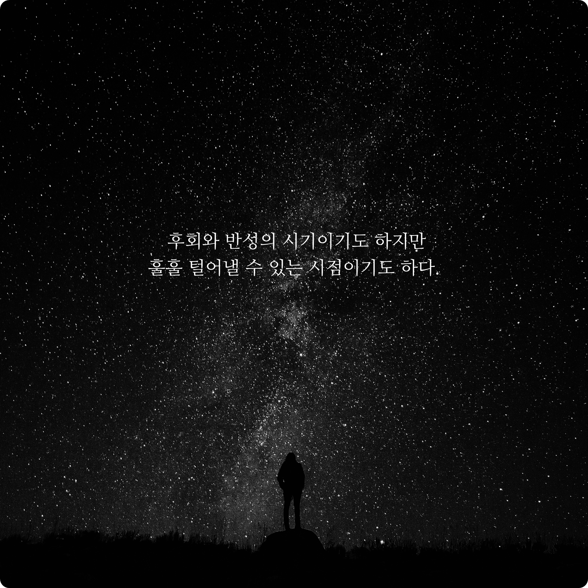 물론 말도 많았고 탈도 많았던 한 해였던 탓에 후회한다는 느낌을 받으며 반성을 하게되는 그런 시점이기도 하지만 또 그것을 역으로 생각한다면 다시 한 번 일어설 수 있는 그런 시점이 되기도 하는 것 같습니다. 성숙한 사람은 항상 부정에서 긍정으로의 전환을 스스로가 해낼 수 있는 법이죠.