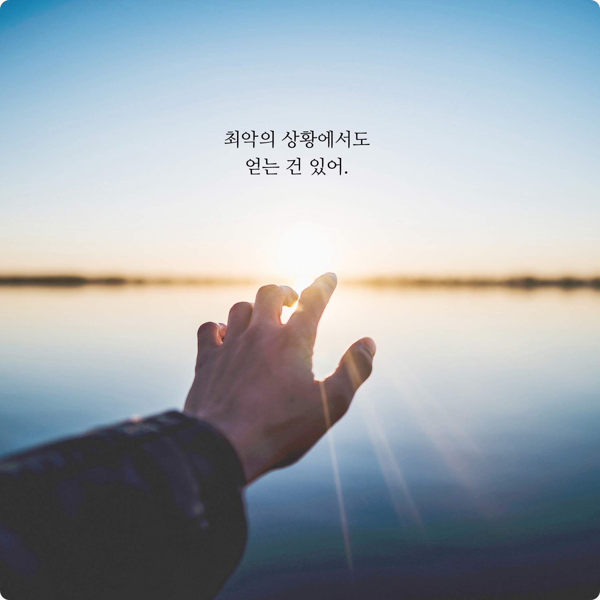 어떠한 상황이 찾아와도 그 안에는 느낌이 있고 깨달음이 있으며 얻을 것도 분명 있습니다. 그래서 어떠한 극한의 상황에서도 얻게되는 것이 있다고 표현하였습니다. 이렇게 다양한 글들을 작성해봤는데요. 여러분들이 가장 마음에 드시는 문장은 무엇이었는지 궁금합니다^^ 어려움과 아쉬움이 많았던 한해였지만 모두 훌훌 털고 새로운 한 해를 맞이했으면 좋겠습니다.