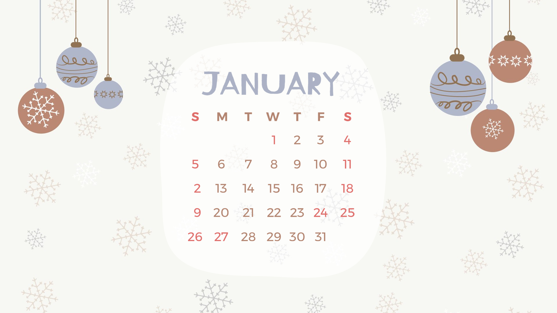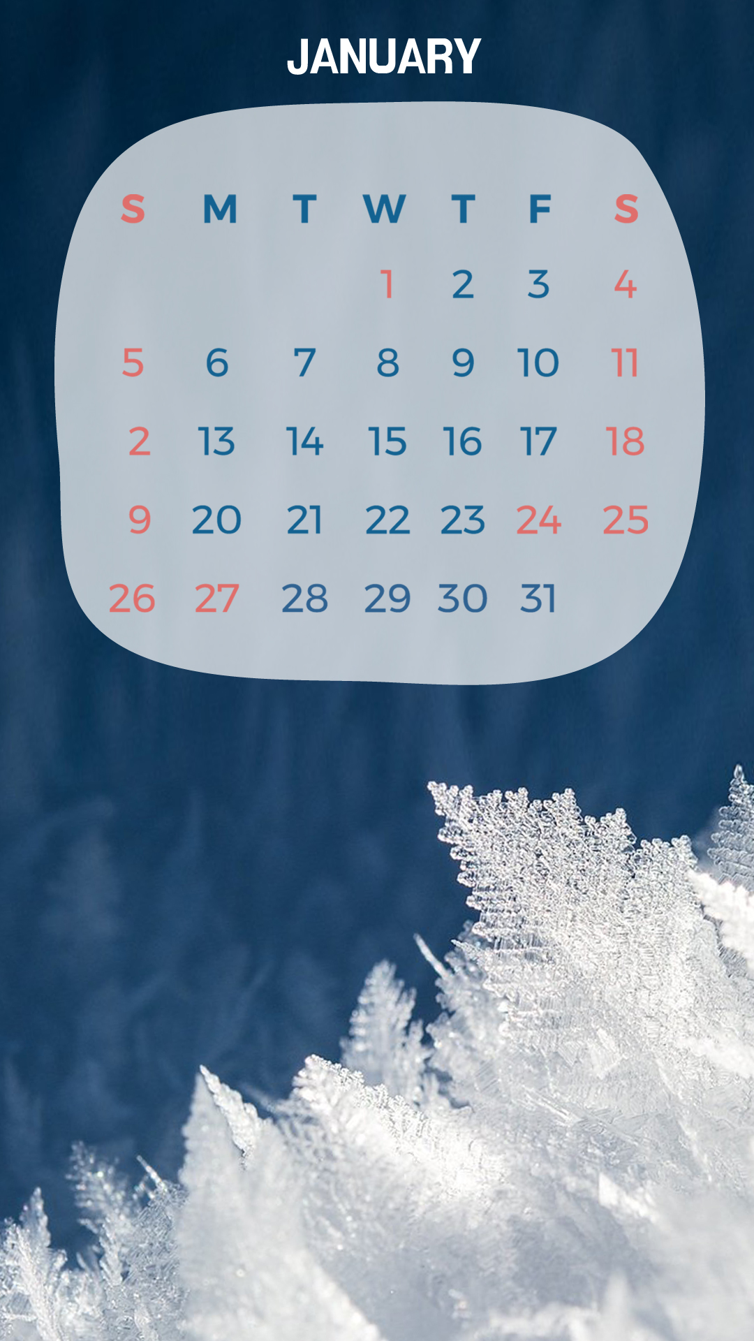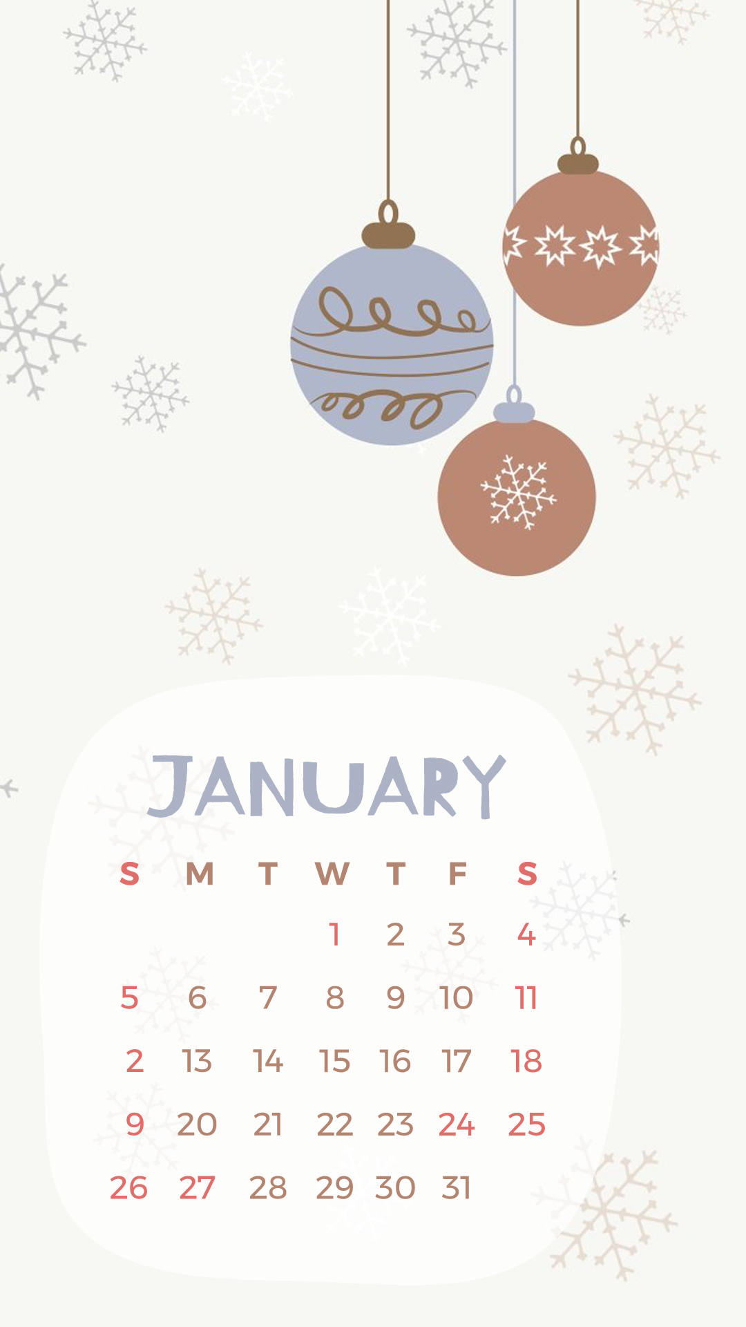다음으로 살펴볼 테마는 바로 크리스마스 트리 장식과 어우러진 깔끔한 1월 달력 일러스트입니다. 눈꽃 송이 모양이 새겨져 있으며 그 앞으로 달력이 위치해 있습니다.