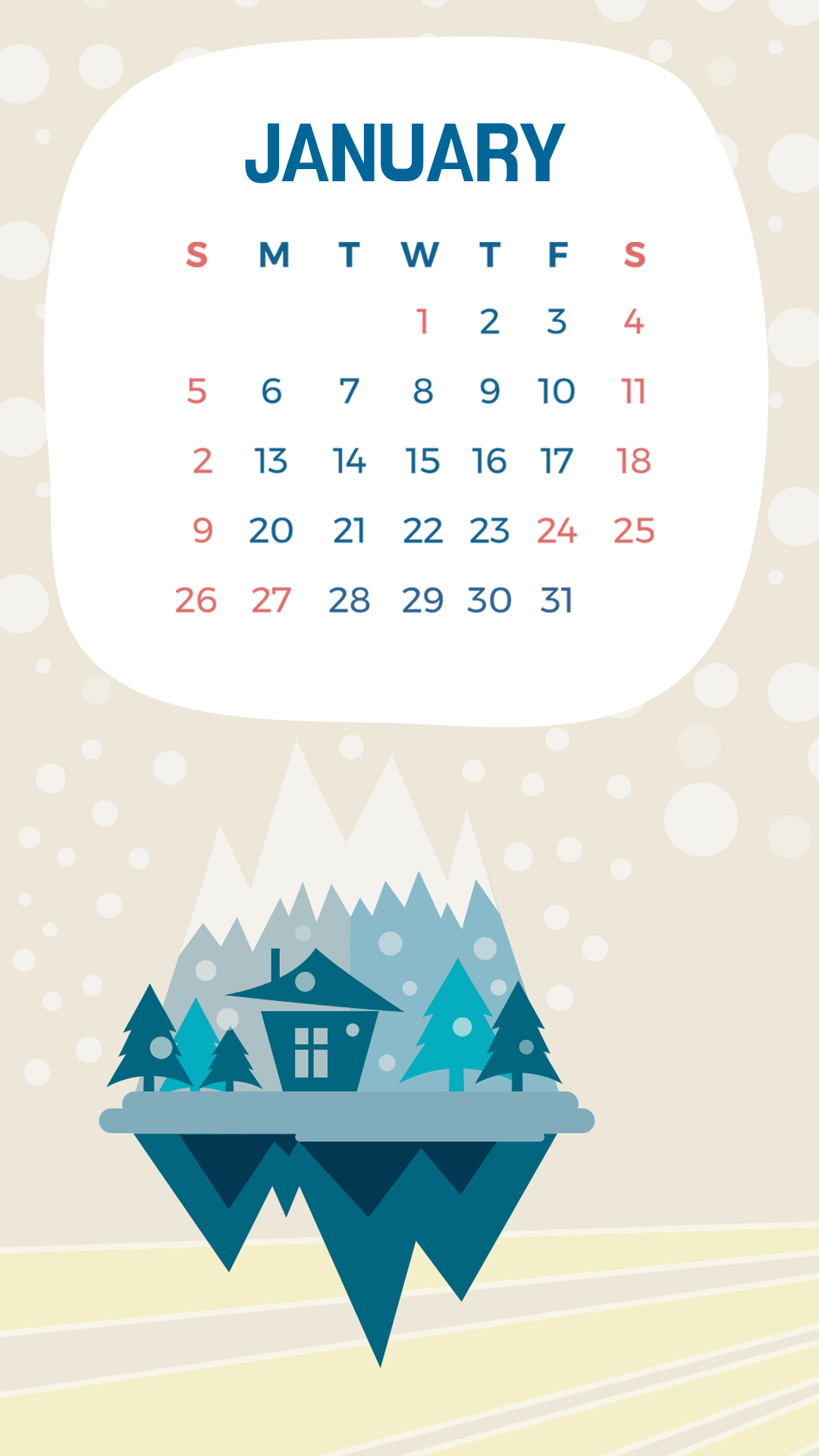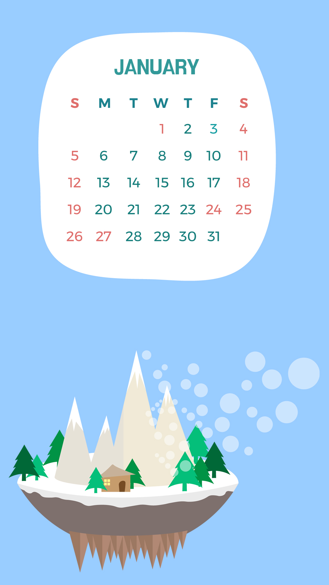 이번에는 공중에 떠있는 눈 덮인 섬의 모습입니다. 그 위에 몽환적인 빛들이 흩날리고 있는 듯한 하늘색의 배경에 적은 1월 달력입니다. 스마트폰용 이미지로는 각각 달력과 눈 섬의 그림 위치의 순서를 바꾸어봤습니다.