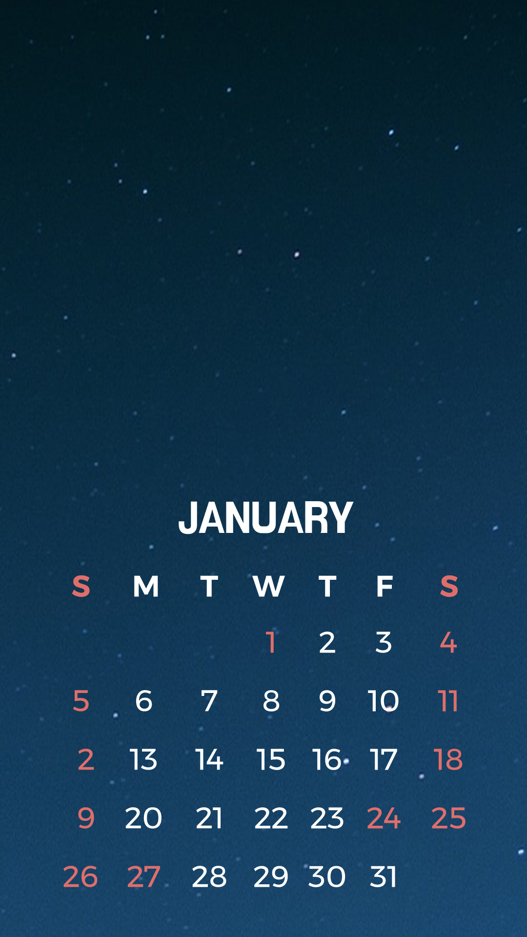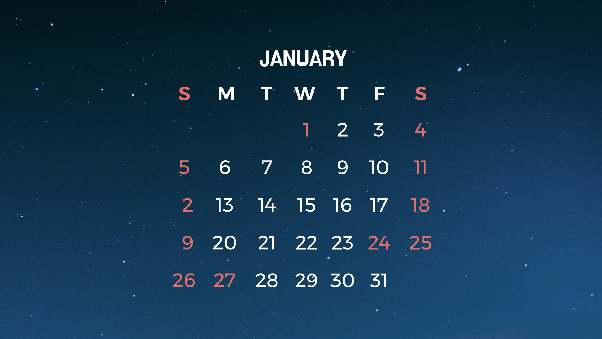 먼저 첫 번재로 감상해볼 2020년 달력 이미지는 바로 짙은 밤하늘 또는 푸른 밤하늘에 별이 있는 배경 위에 편집된 달력이고요. 깔끔한 것을 선호하신다면 이런 달력에 별도의 띠가 없는 이런 이미지가 좋을 것 같습니다.