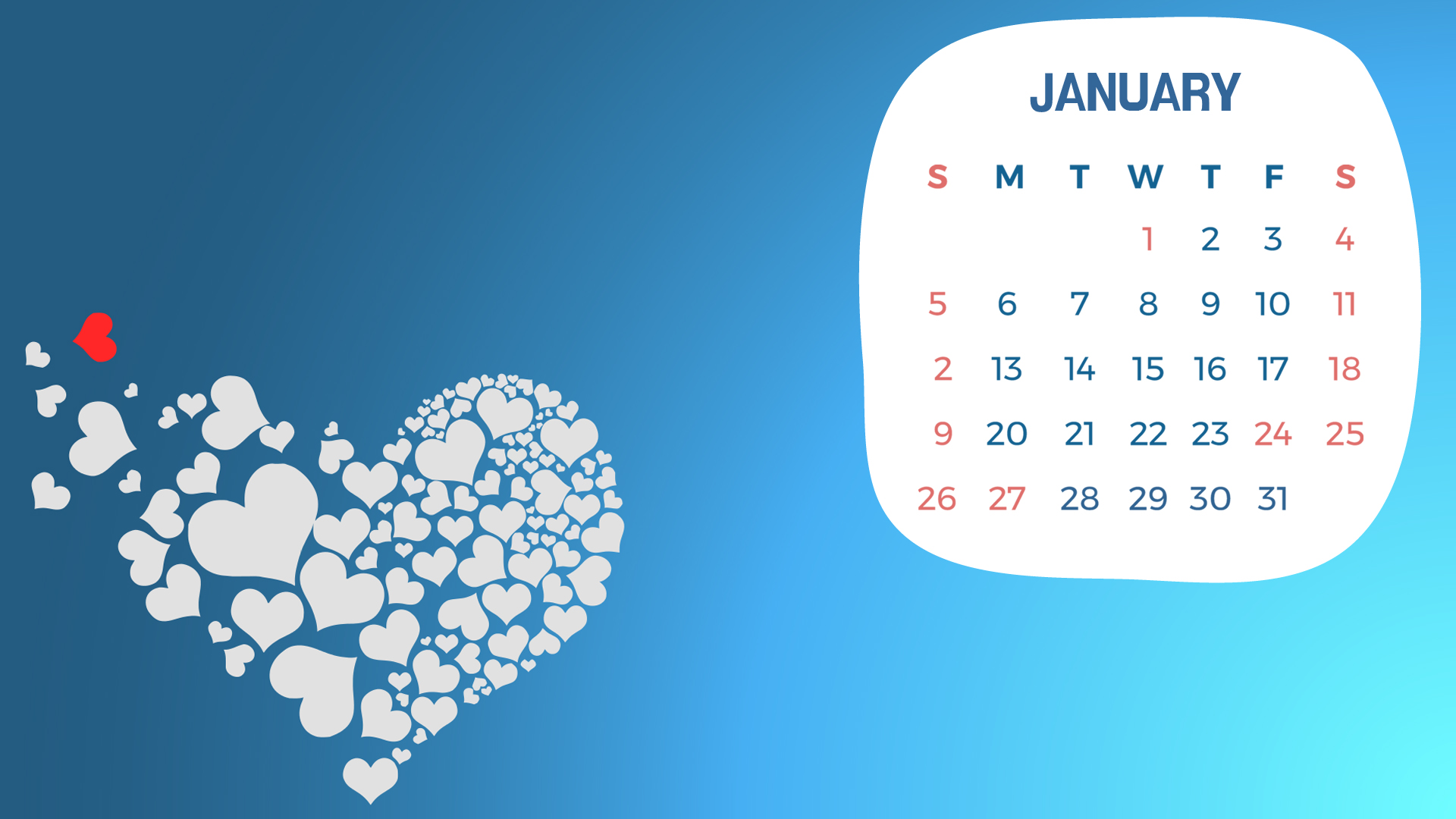 이번에는 파란색의 배경에 하트 조각들이 모여 다시 한 번 더 하트를 이루는 이미지인데요. 하나의 조각만 빨간색으로 표현하여 포인트를 강조한 그림입니다. 그 위에 흰색의 배경을 하고 있는 달력이 그려져 있고요.