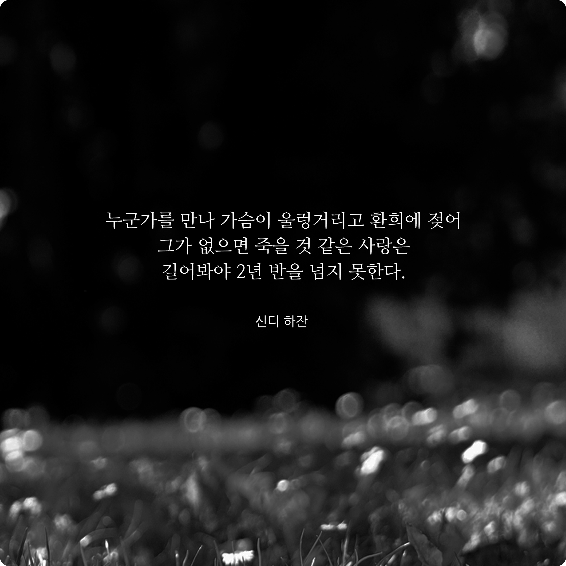 누군가를 만나 가슴이 울렁거리고 환희에 젖고 그가 없어 죽을 것 같은 사랑은 길어봐야 2년 반을 넘지 못한다.
