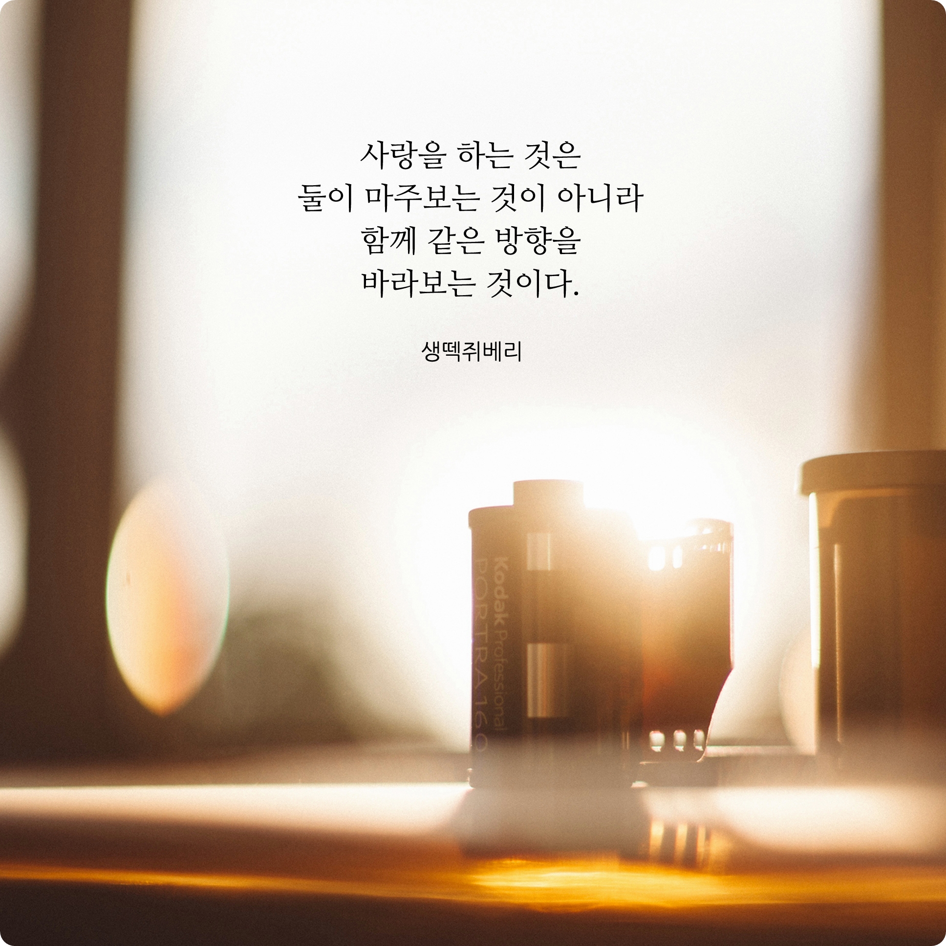 제가 가장 좋아하는 생떽쥐베리의 명언 중 하나입니다. 사랑은 서로가 마주하며 바라보는 오로지 둘만을 위한 사랑은 아니죠. 서로 같은 방향을 향해 걸어가면서 이런저런 현실부분들에 직면하기도 하고 힘든 상황들도 같이 경험하고 그리고 어려운 언덕도 함께 건너가는 끊임없는 과정과도 같죠. 그래서 서로의 뜻이 맞고 함께 나아갈 내 사람이 있다면 이런 과정들은 어떻게 보면 당연한 것들이 아닌가 싶습니다.