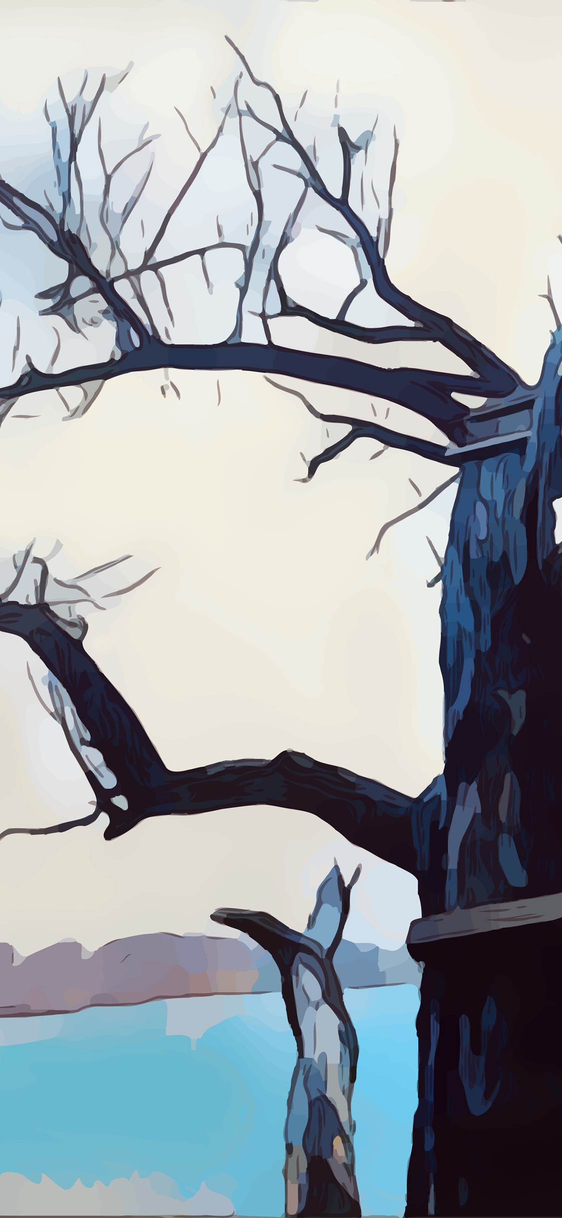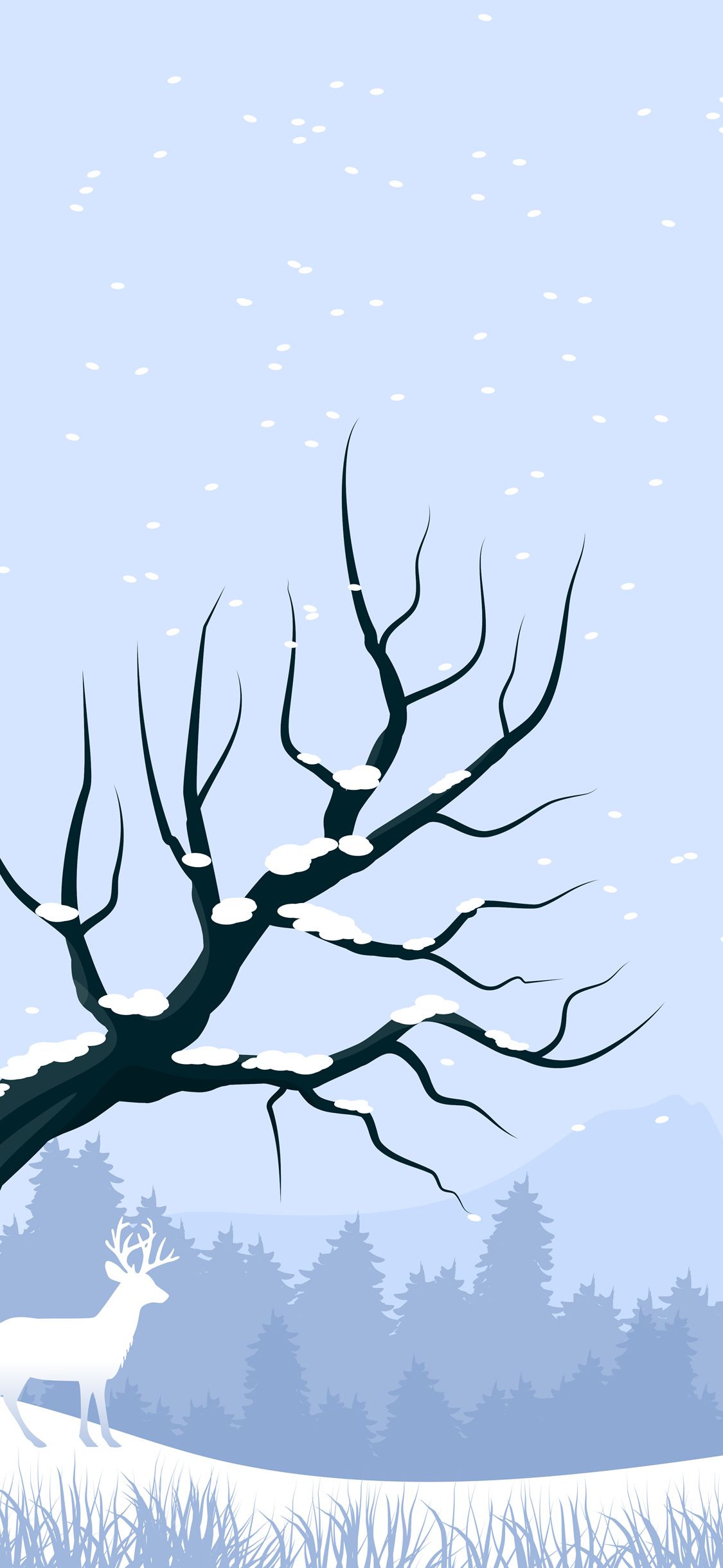 앙상한 나뭇가지가 옆으로 뻗어나 있고 사슴이 들판에서 배회를 하고 있는 듯한 모습의 아이폰 배경화면입니다. 하늘색의 하늘이 너무 예쁜 것 같네요.