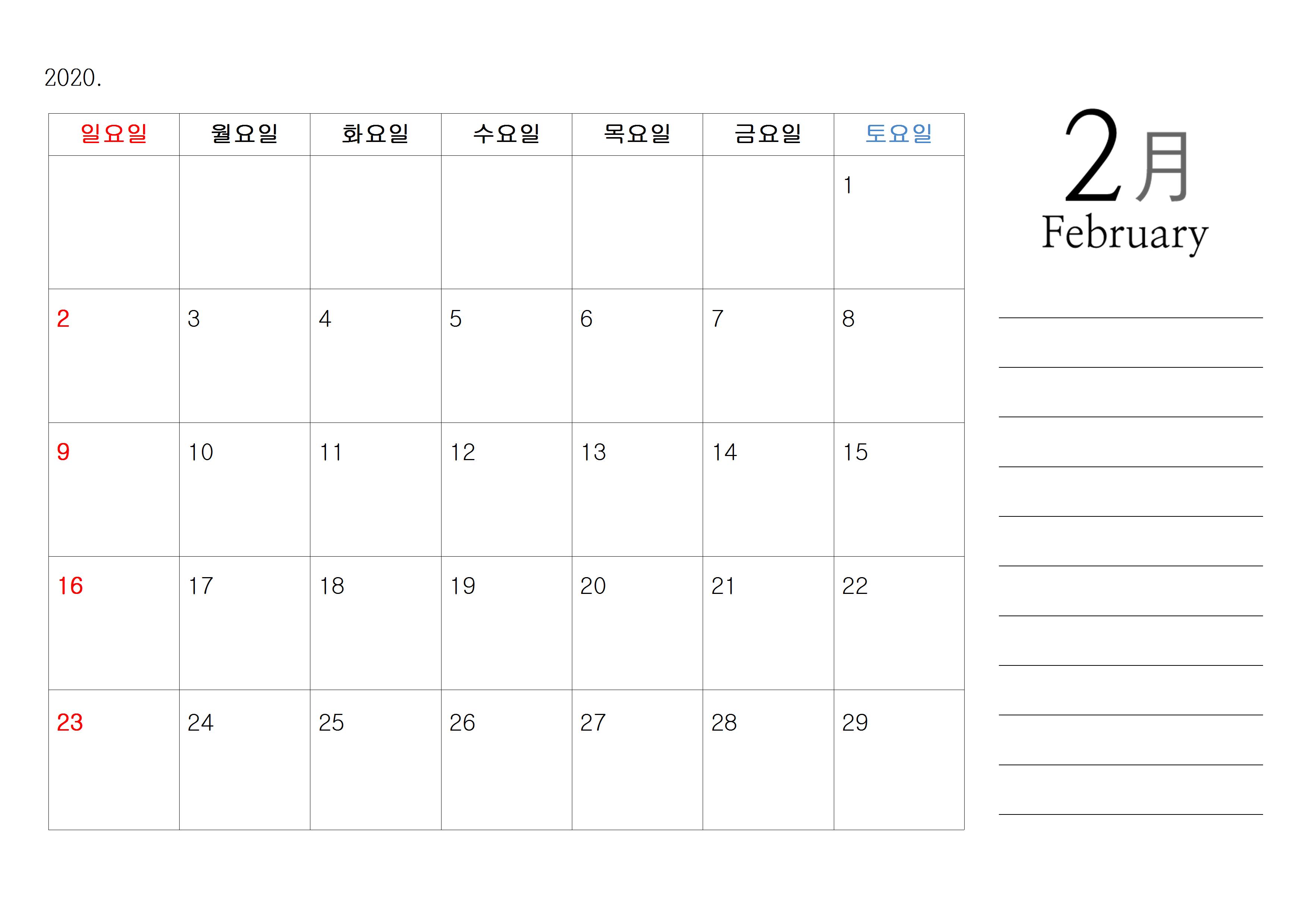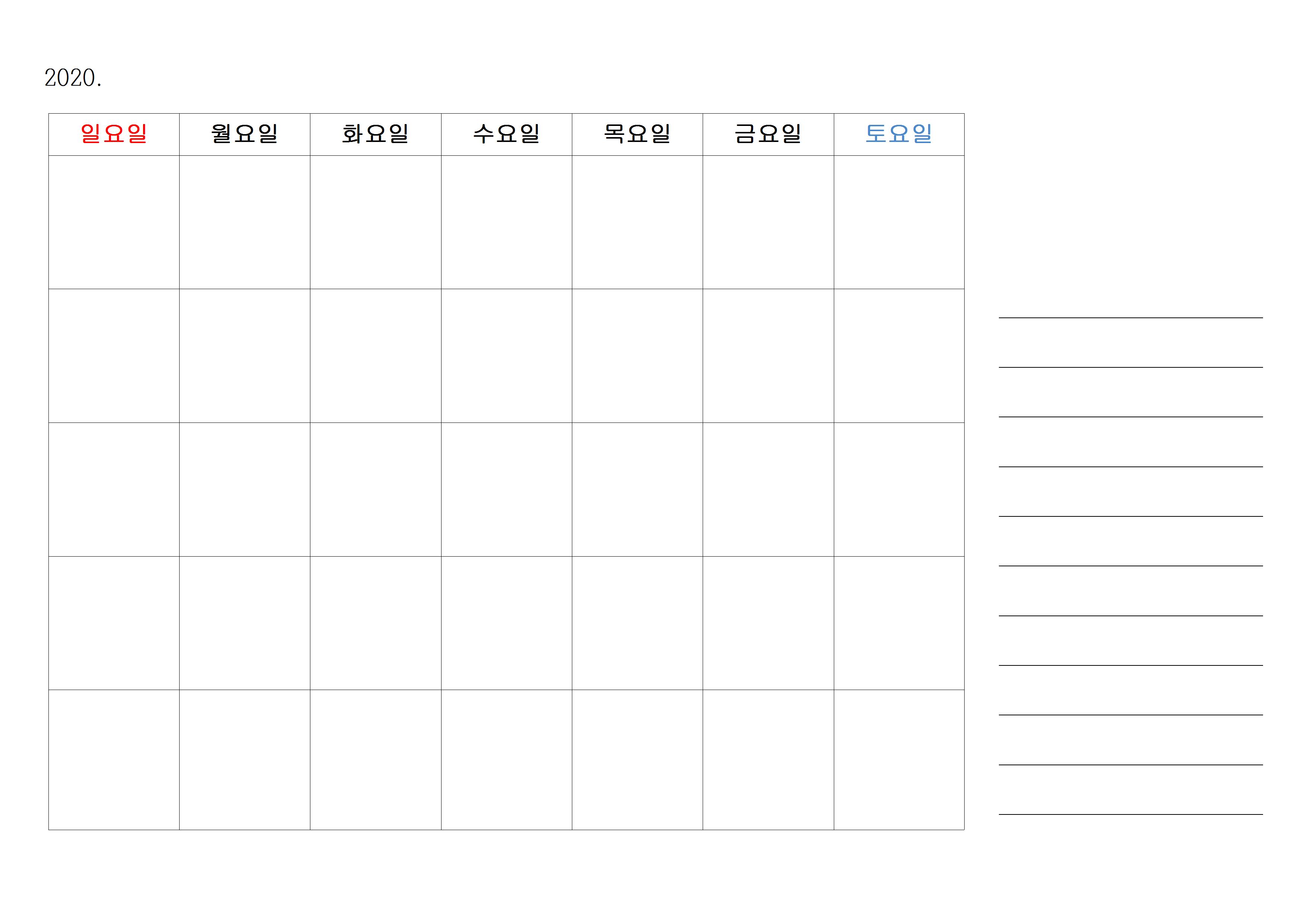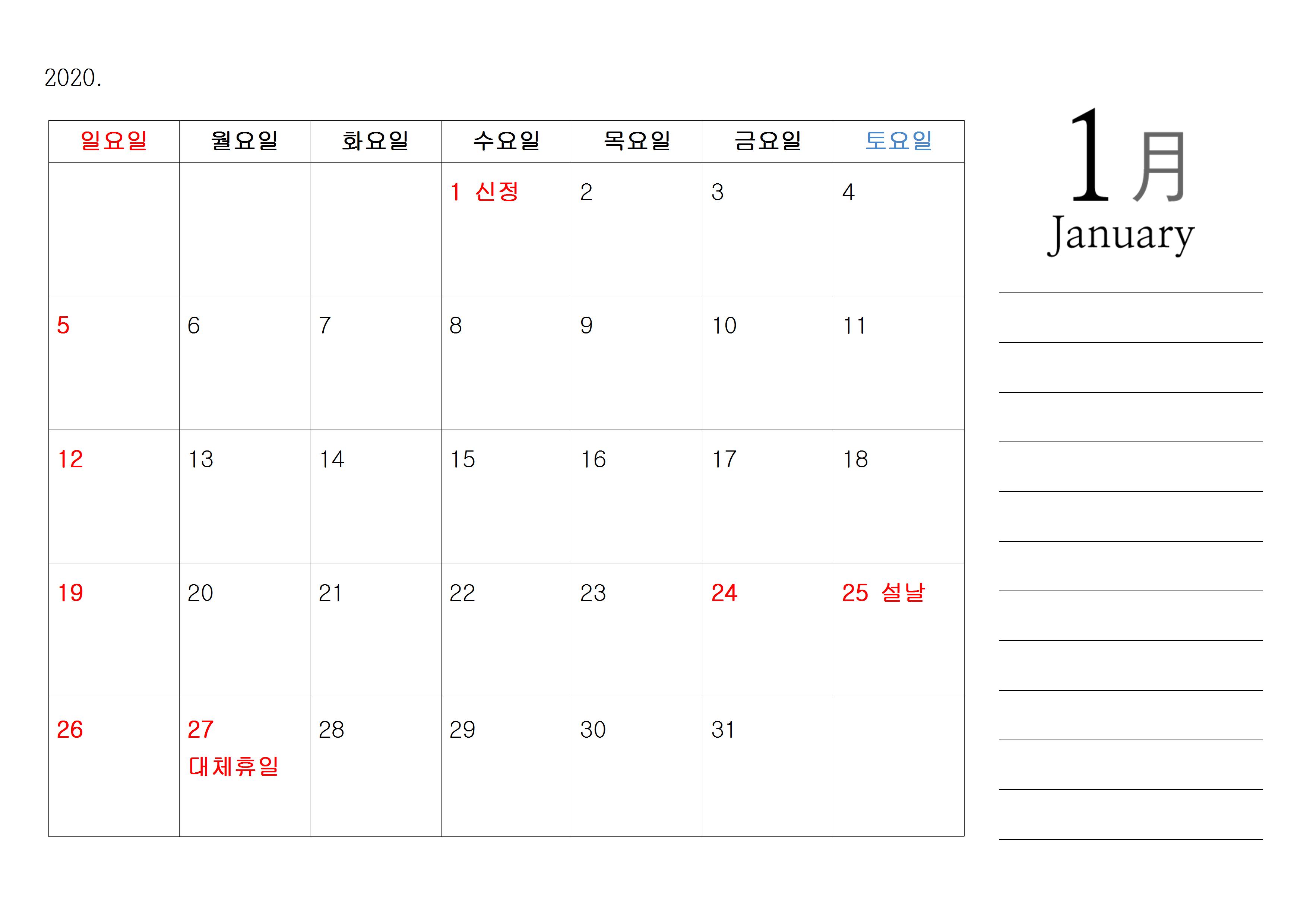 기본에 충실한 2020년 달력 한글 파일입니다. 우리가 또 공짜가 아니면 잘 사용을 안 하기 때문에 직접 2020년 달력을 만들어봤습니다. 제가 직접 만들었기 때문에 당연히 무료 다운로드가 가능하고요. A4 크기의 가로로 누운 크기이기 때문에 프린트나 출력을 하셔도 월별 한 장으로 출력이 가능합니다.