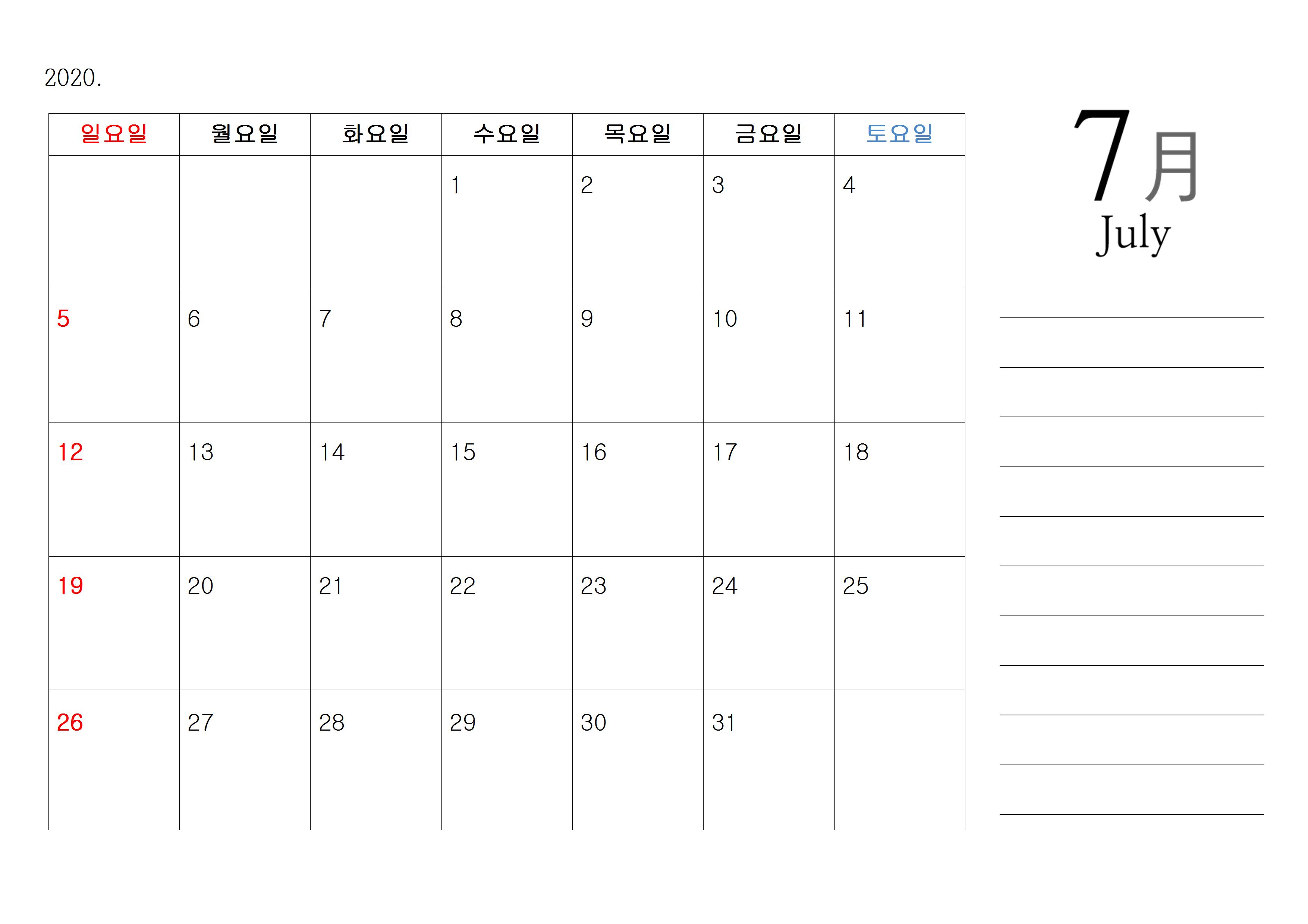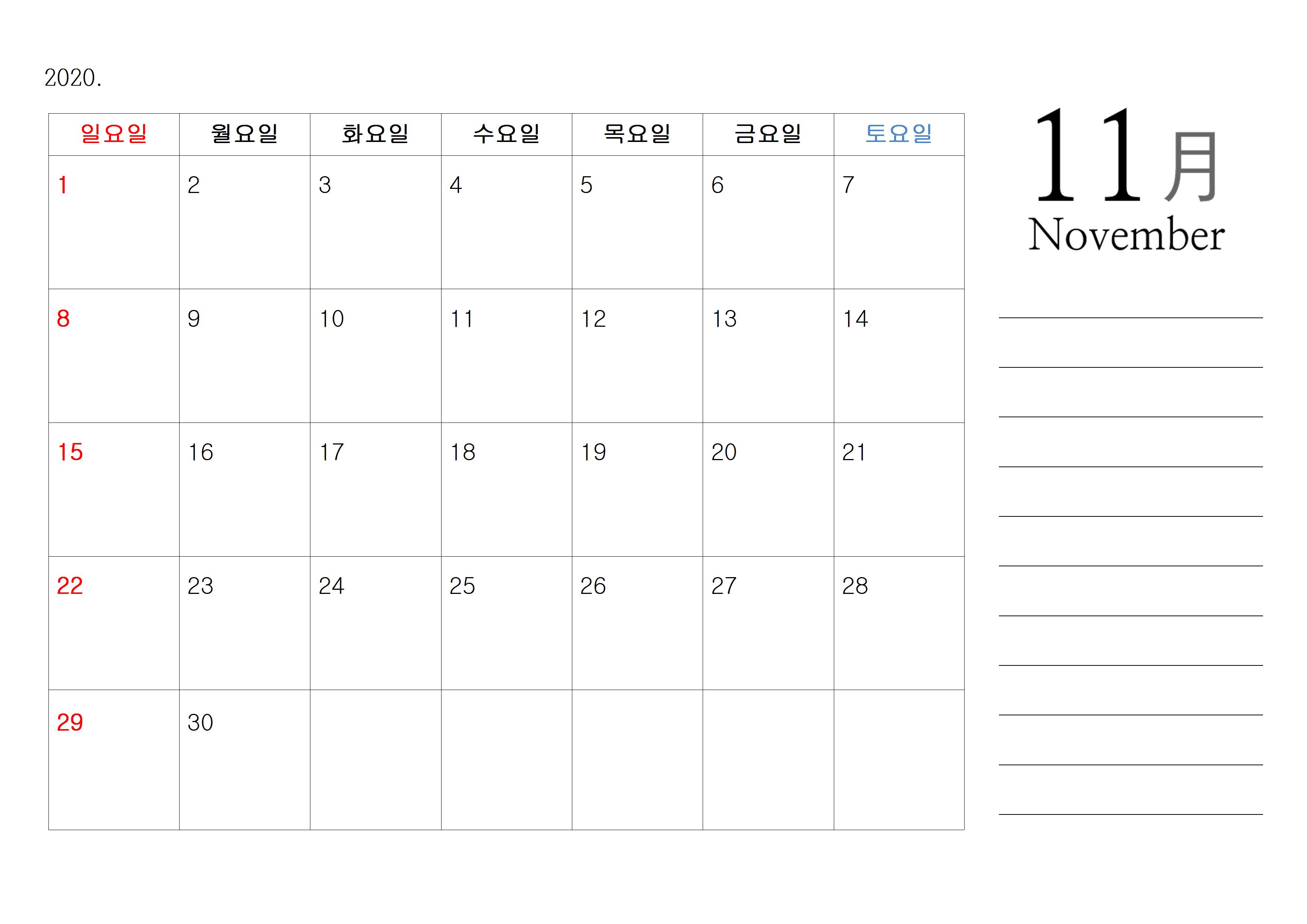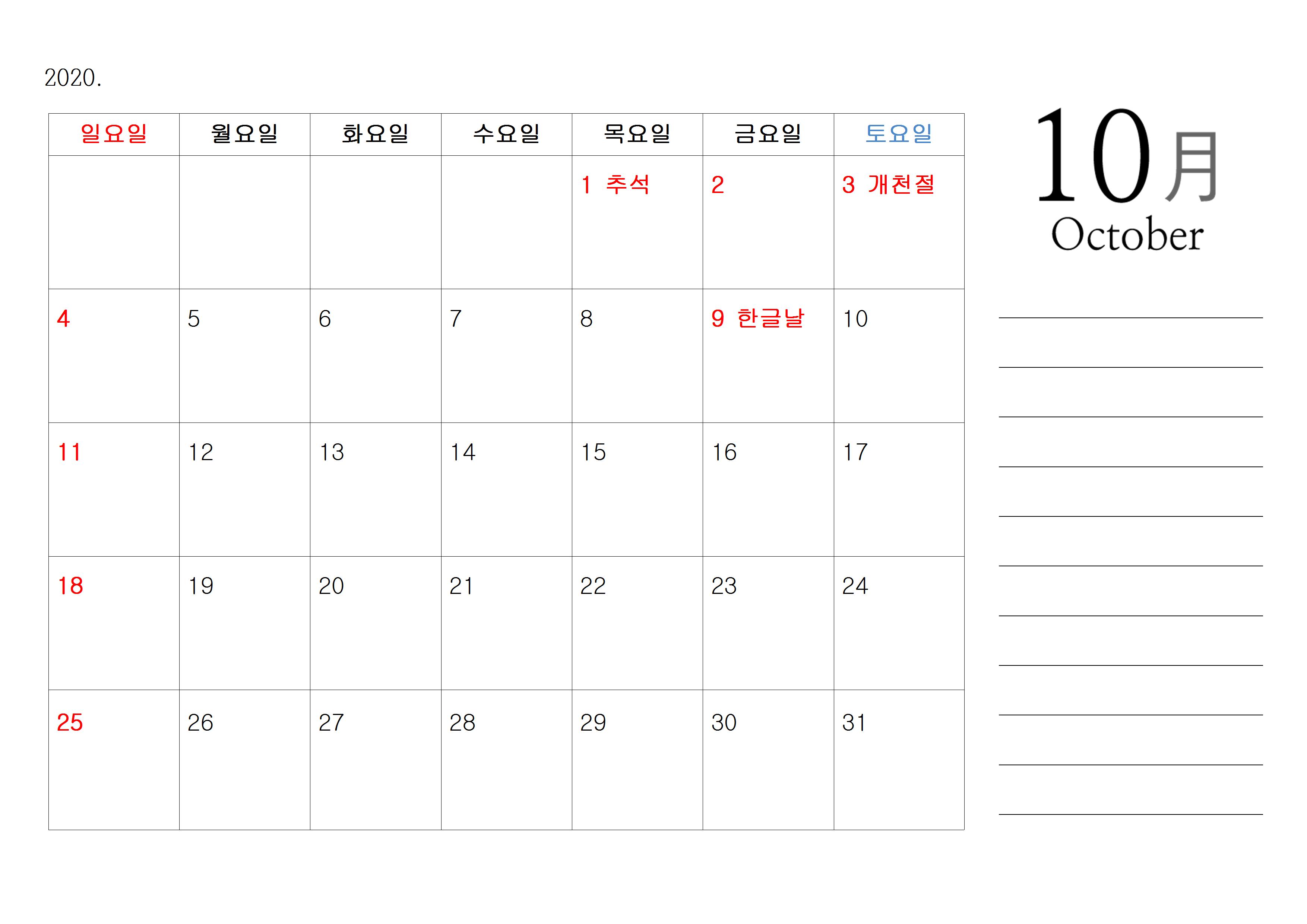 또한 오른쪽에는 메모 란을 만들어 봤으며, 딱히 예쁘게 디자인을 한 것이 아니기 때문에 디자인적인 부분보다는 그냥 기본에 충실하면서도 깔끔한 달력이라고 생각하면 좋을 것 같고요. 한글파일에 능숙하신 분들이라면 취향에 맞게 멋지게 편집을 하셔도 좋을 것 같습니다.