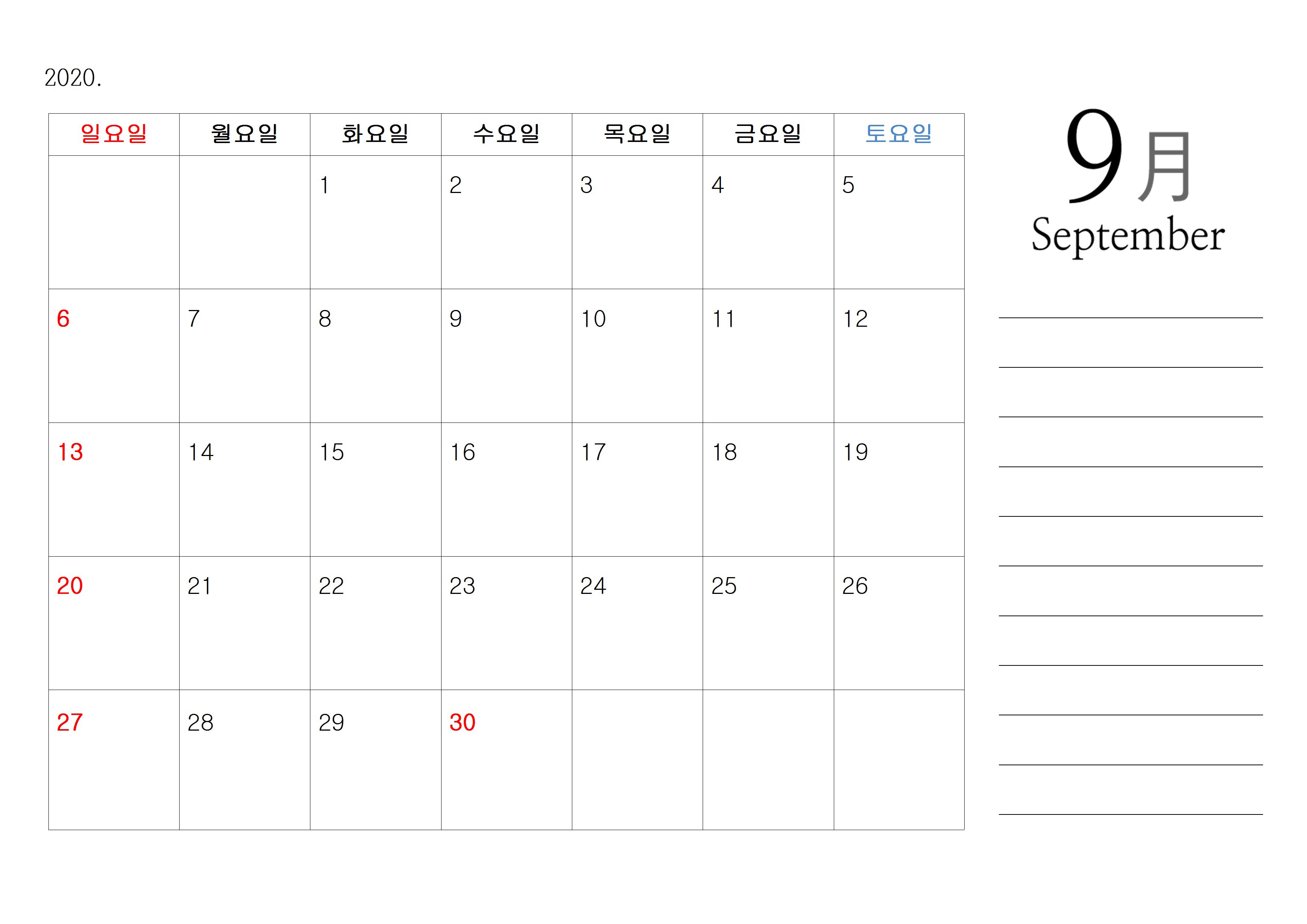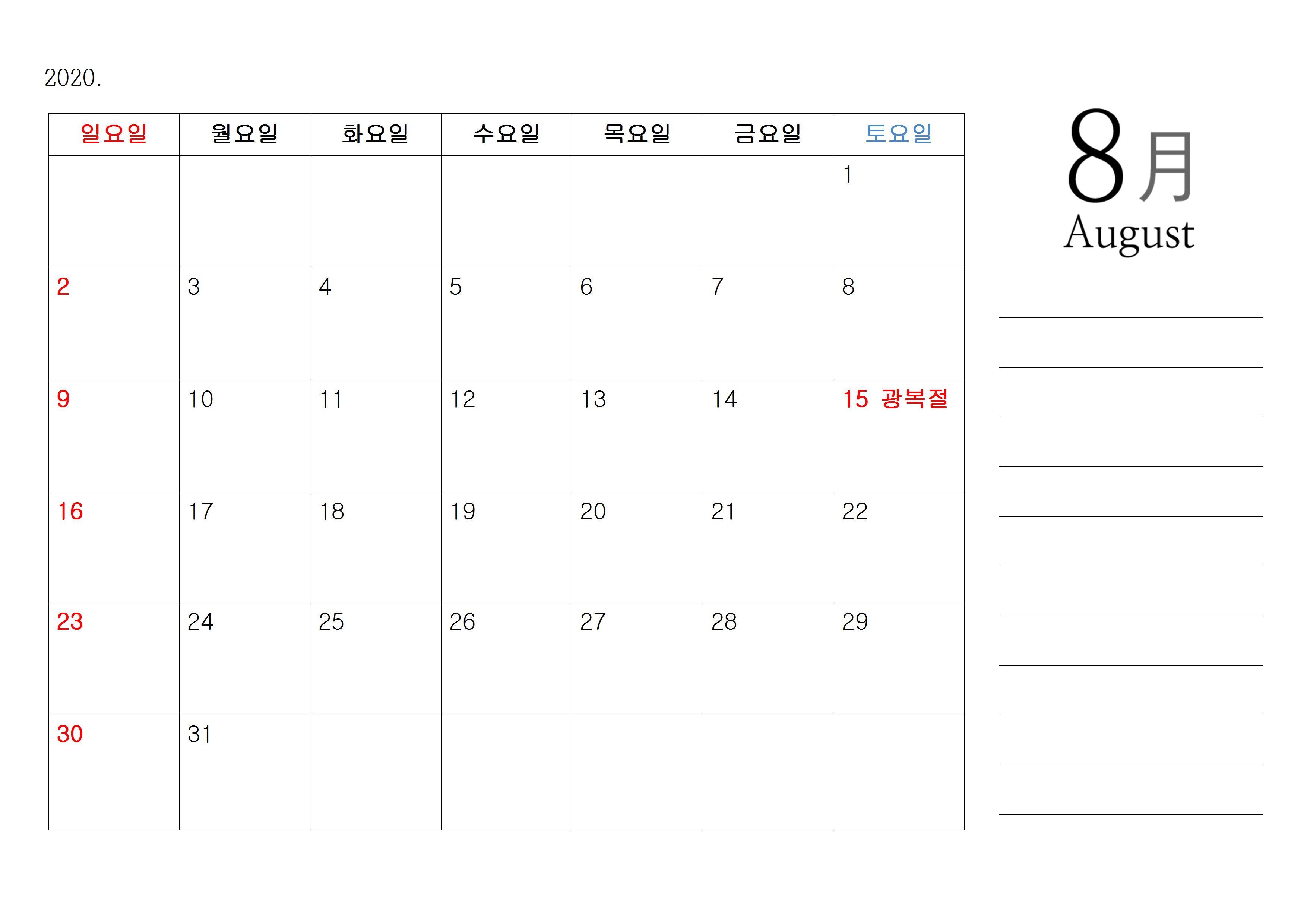 달력에서 파란색에 해당이 되는 휴일이 아닌 기념일은 모두 제외를 했으며, 심플하게 빨간 날인 공휴일 및 국가 지정 휴일만 표기를 하였으며, 달력 셀 안에 날짜는 왼쪽 위에 숫자가 기재가 되었기 때문에 각 셀 안에 두 줄 정도는 추가적으로 기념일이나 이벤트를 적으시기 좋은 달력입니다.