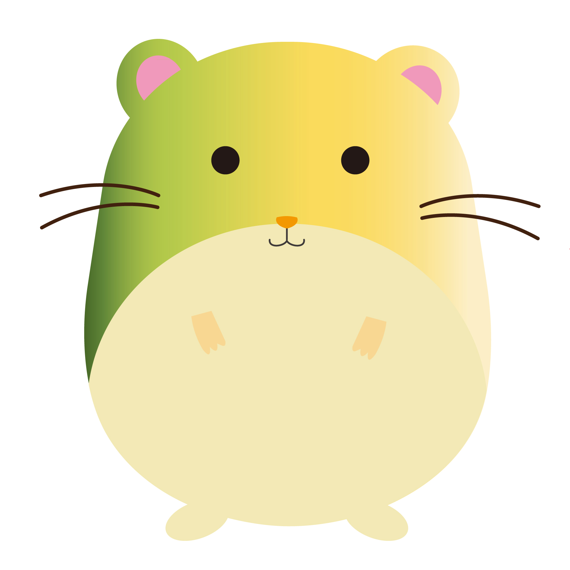 이번에는 조금 다른 형태의 캐릭터인데요. 수염이 양옆으로 두 가닥 나 있고 팔은 가지런히 배 위에 놓은 모습으로 서 있는 살짝 길쭉한 체형을 자랑하는 쥐입니다. 몸통은 초록색과 노란색의 그라데이션이 자연스럽게 들어가 있는 상태이며 코 잎에 입은 조그마하게 웃고 있는듯한 모양입니다.