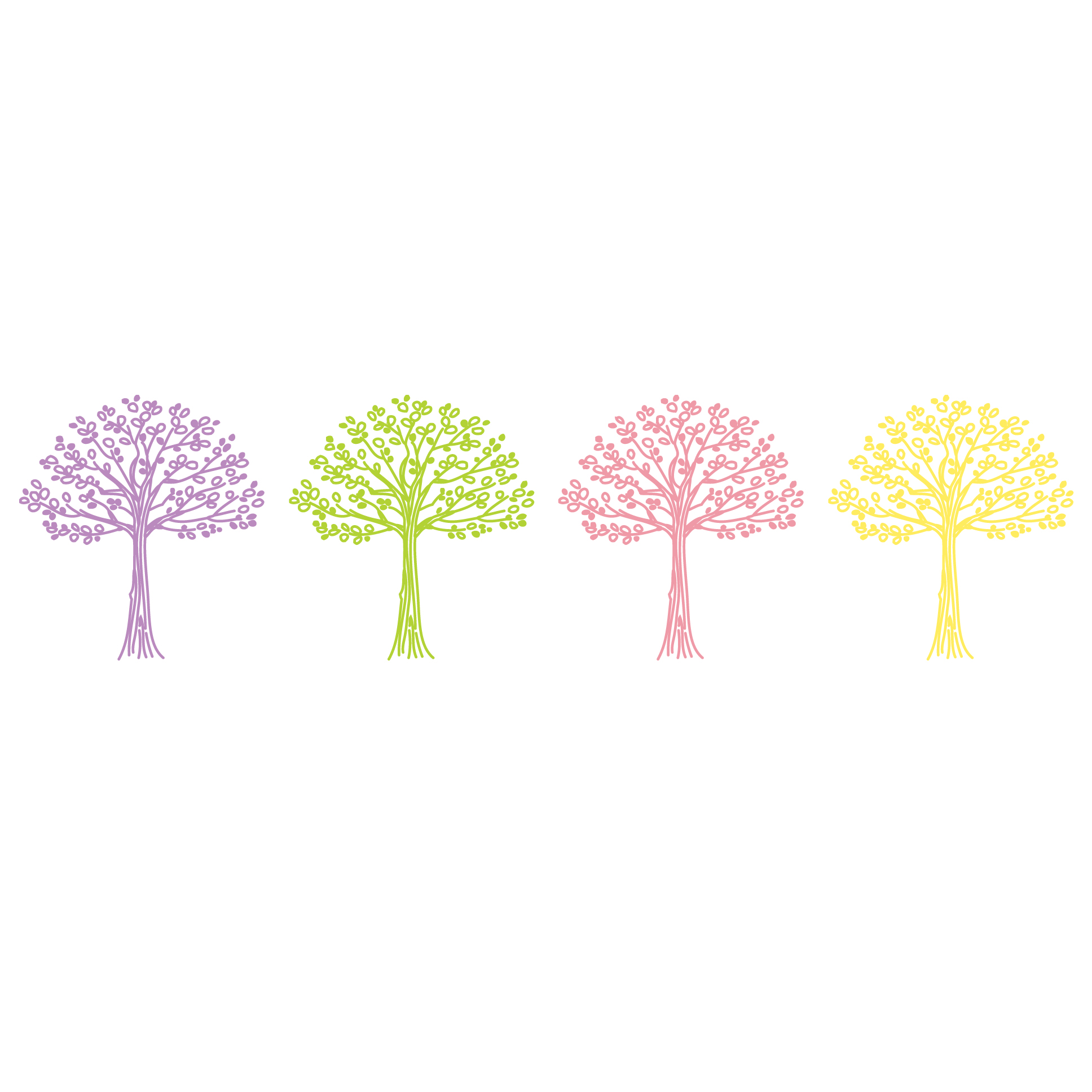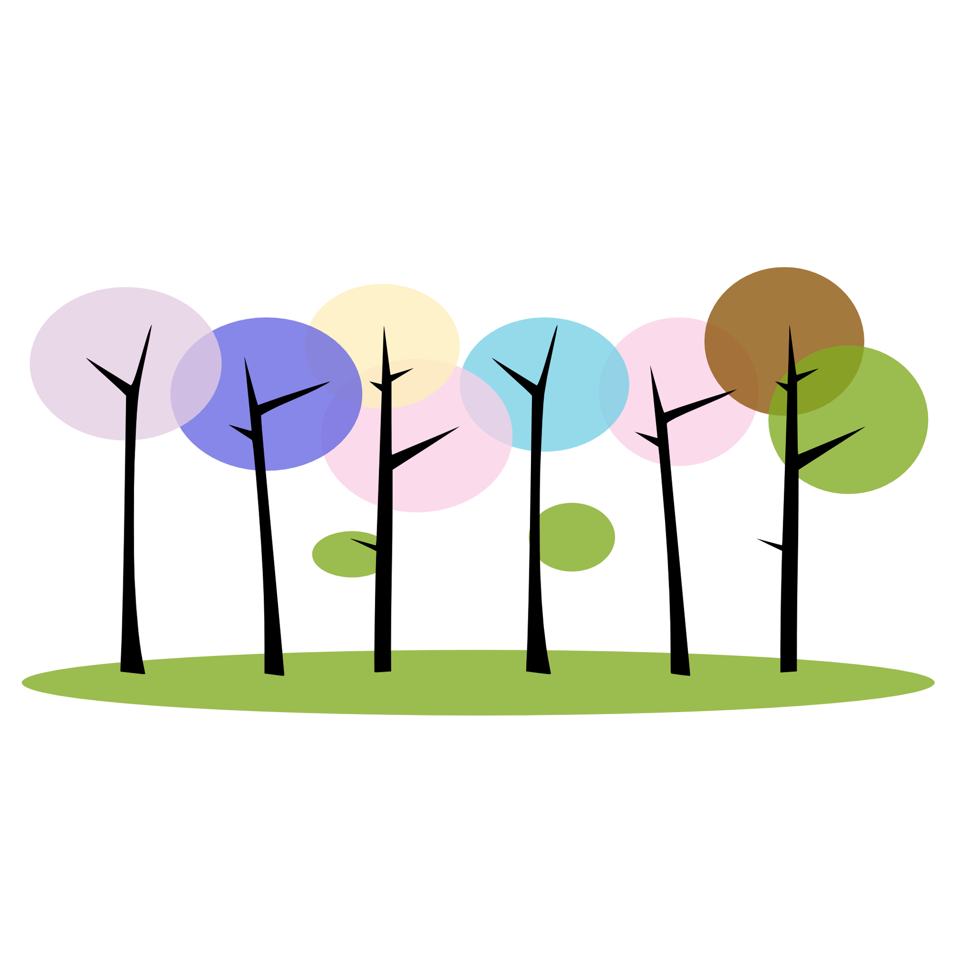 깔끔하게 도형으로 표현이 이루어진 나무 도안 이미지입니다. 나무 기둥 기둥의 크기는 모두 동일하지만 기둥에 붙어있는 가지의 위치는 조금씩 다르고요. 윗부분에는 여러 가지 도형을 올려 놓은 듯한 다양한 모양의 나무 형태가 여러 컬러들로 나열되어 있는 이미지입니다. 물방울 모양을 하고 있는 빨간색 나무도 있고요. 뭉게구름 또는 곱슬머리처럼 생긴 울퉁 불퉁한 모양도 있습니다.