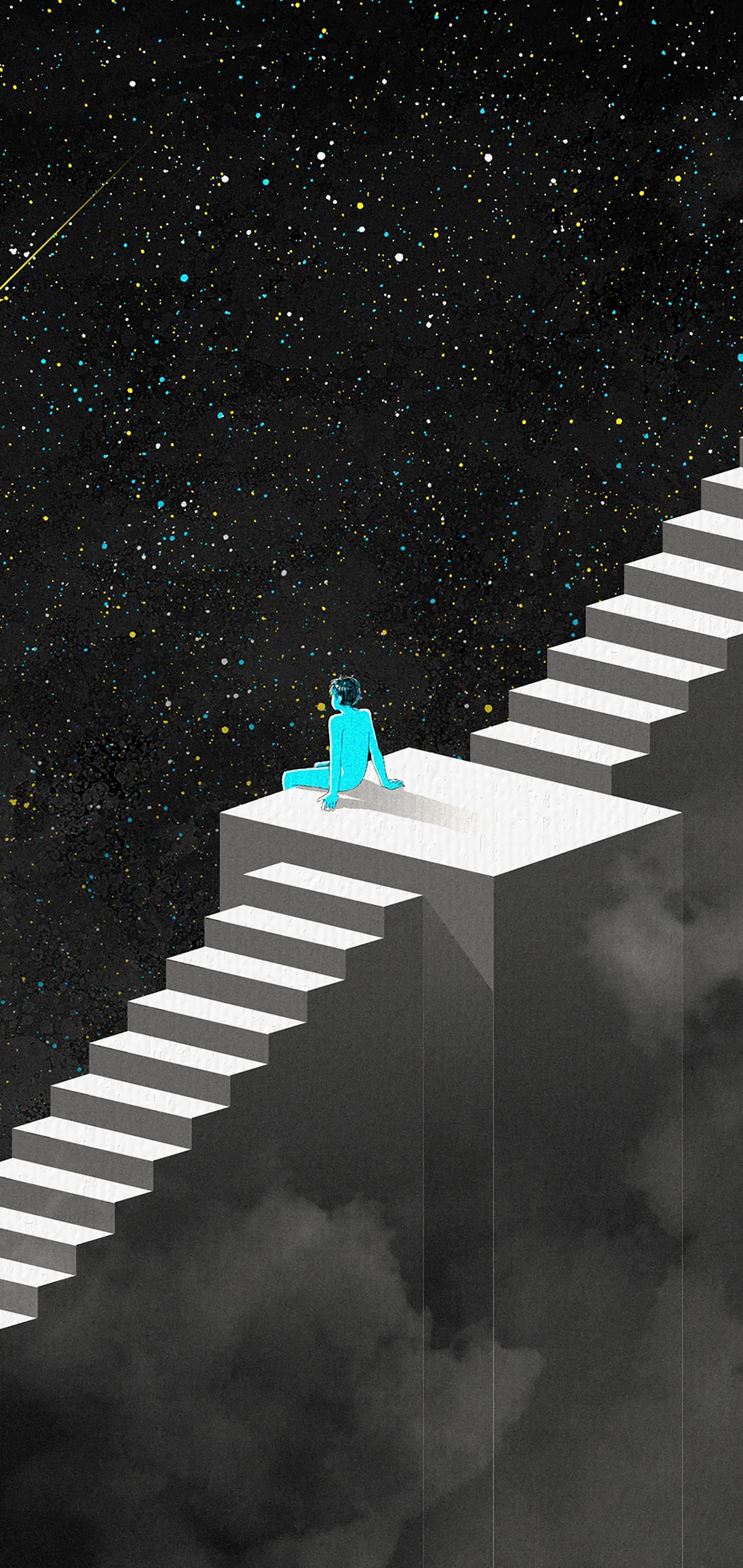 남자가 강 호숫가에서 하늘을 바라보고 있는 감성사진입니다.