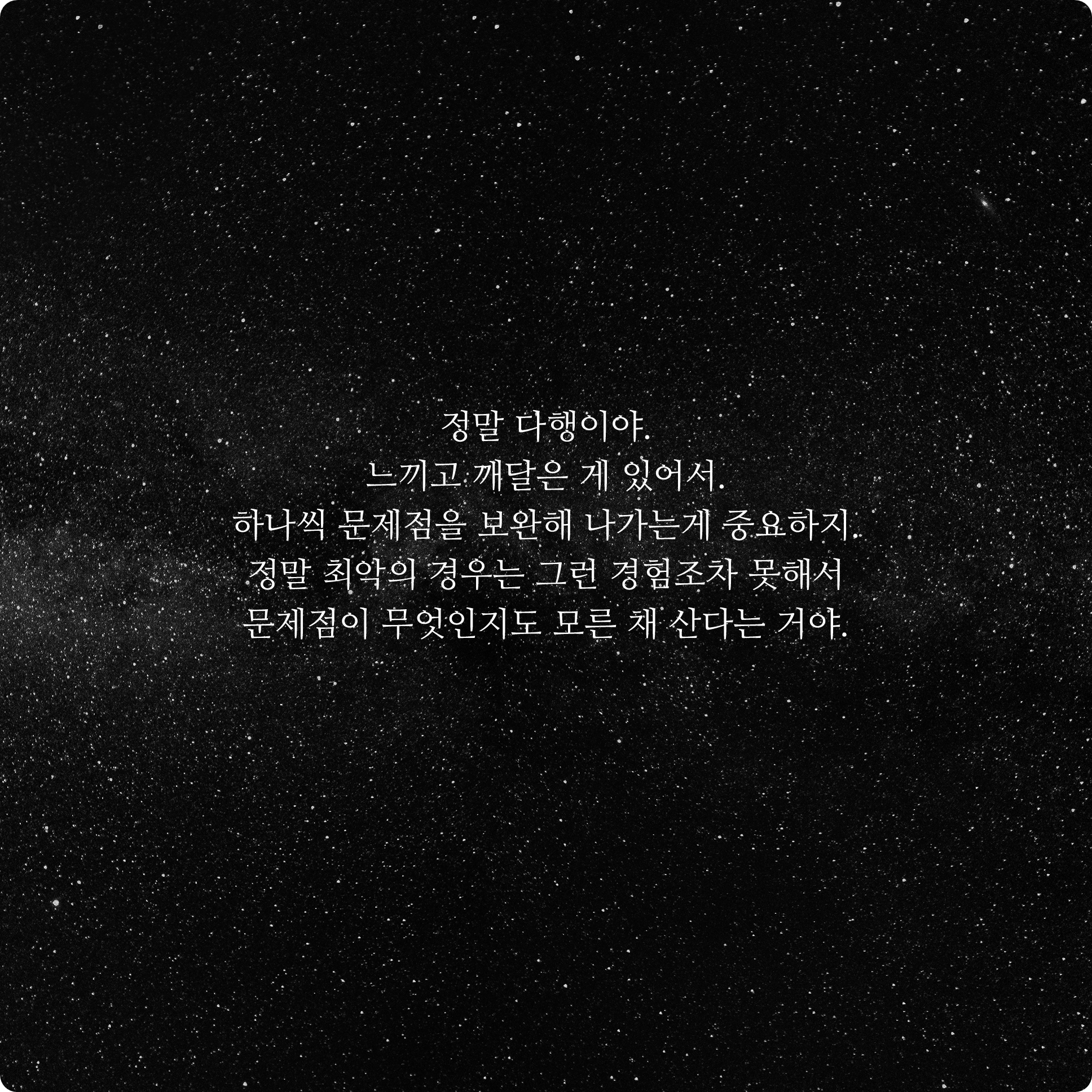 정말 다행이야. 느끼고 깨달은 게 있어서. 하나씩 문제점을 보완해 나가는게 중요하지. 정말 최악의 경우는 그런 경험조차 못해서 문제점이 모른 채 산다는 거야.