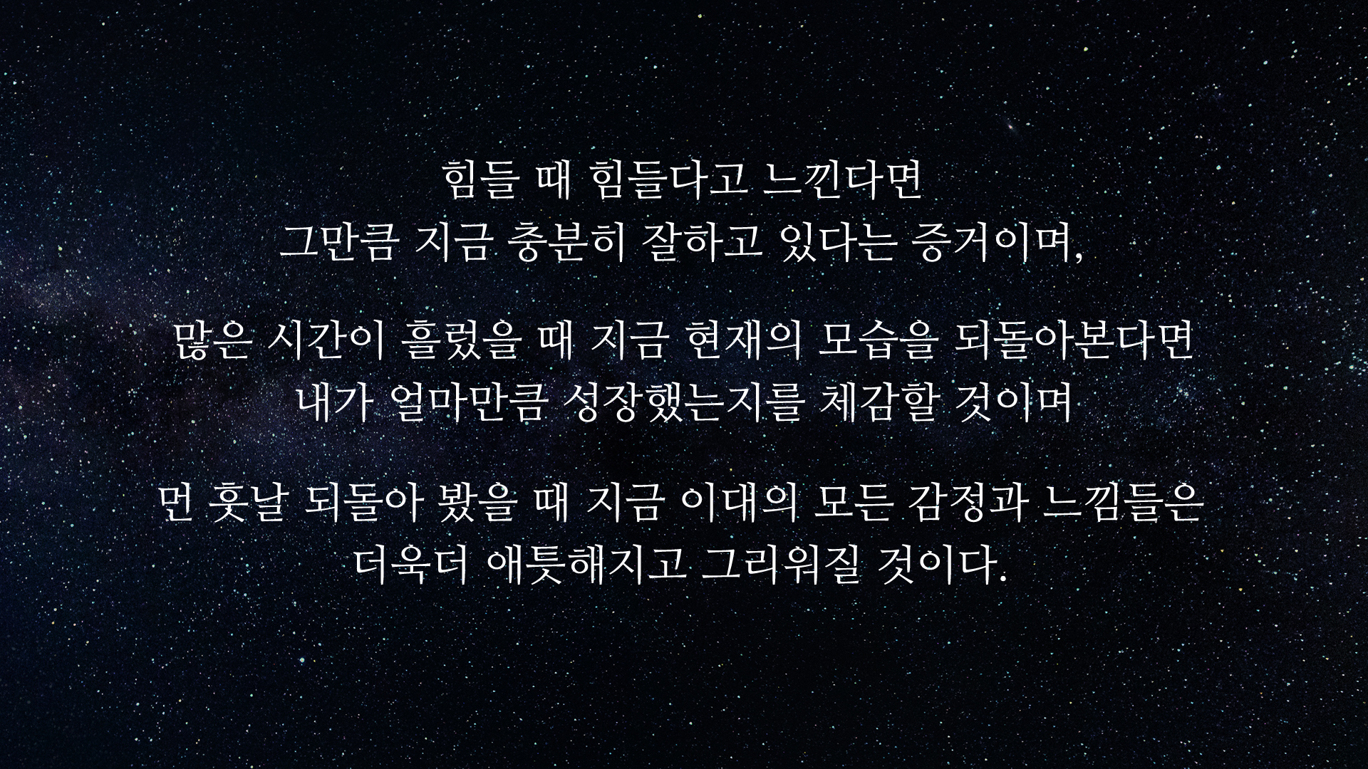 힘들 때 힘들다고 느낀다면 그만큼 지금 충분히 잘하고 있다는 증거이며, 많은 시간이 흘렀을 때 지금 현재의 모습을 되돌아본다면 내가 얼마만큼 성장했는지를 체감할 것이며, 먼 훗날 되돌아 봤을 때 지금 이때의 모든 감정과 느김들은 더욱 더 애틋해지고 그리워질 것이다.