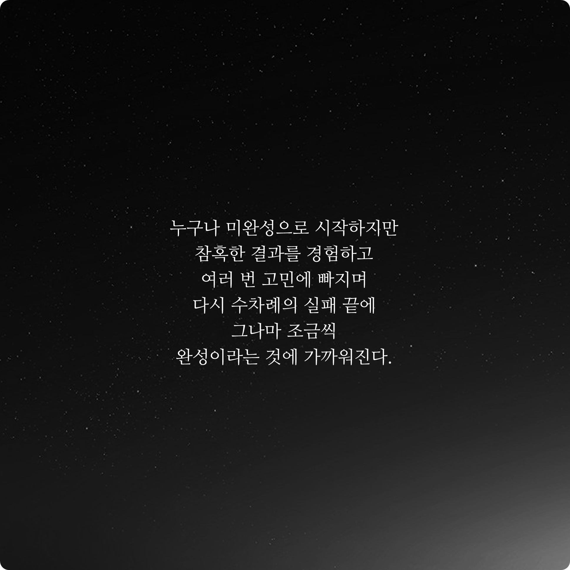 누구나 미완성으로 시작하지만 참혹한 결과를 경험하고 여러 번 고민에 빠지며 다시 수차례의 실패 끝에 그나마 조금씩 완성이라는 것에 가까워진다.
