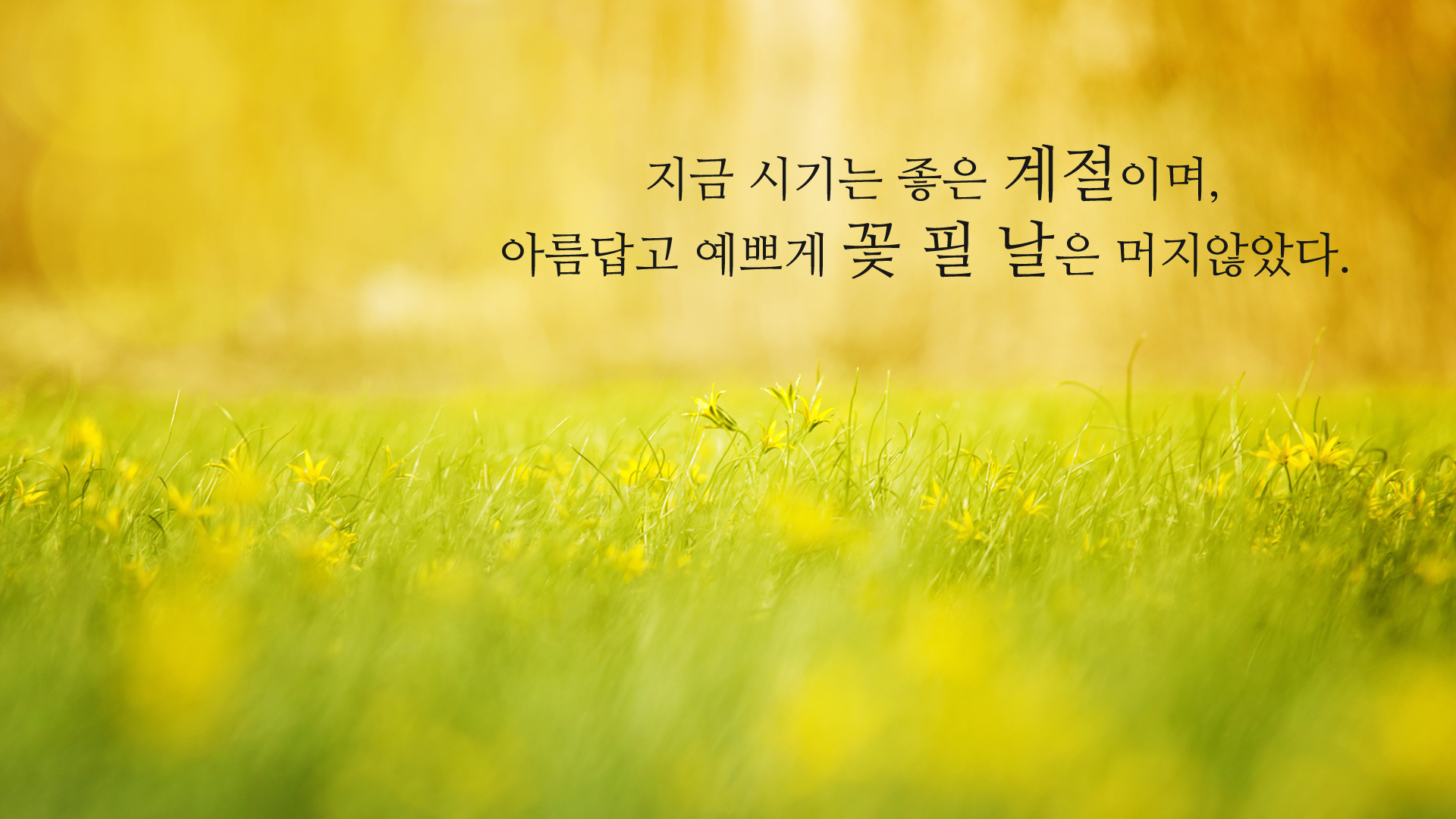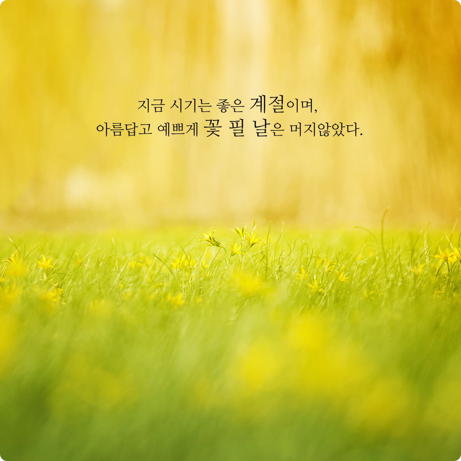 현재의 시기는 좋은 계절이라는 것에 비유를 해봤고요. 조금은 더 나아질 수 있는 삶, 좋은 결과로 이어질 수 있는 날을 '꽃 필 날'로 비유를 해봤습니다. 어쩌면 내가 하고자 하는 바람이 있다면 그것을 할 수 있는 가장 좋은 적기는 바로 지금이며, 그 목표를 위해 오랫동안 지속적인 노력을 하다 보면 좋은 결과들은 반드시 찾아올 것이랍니다. 단지 시간 차이는 있을 수 있습니다. 하지만 훗날의 미래를 위해 실천을 하고 실행을 하느냐 또는 아무것도 안 하느냐 차이입니다. 아무런 노력을 하지 않는다면 미래는 변하지 않을 테니까요.
