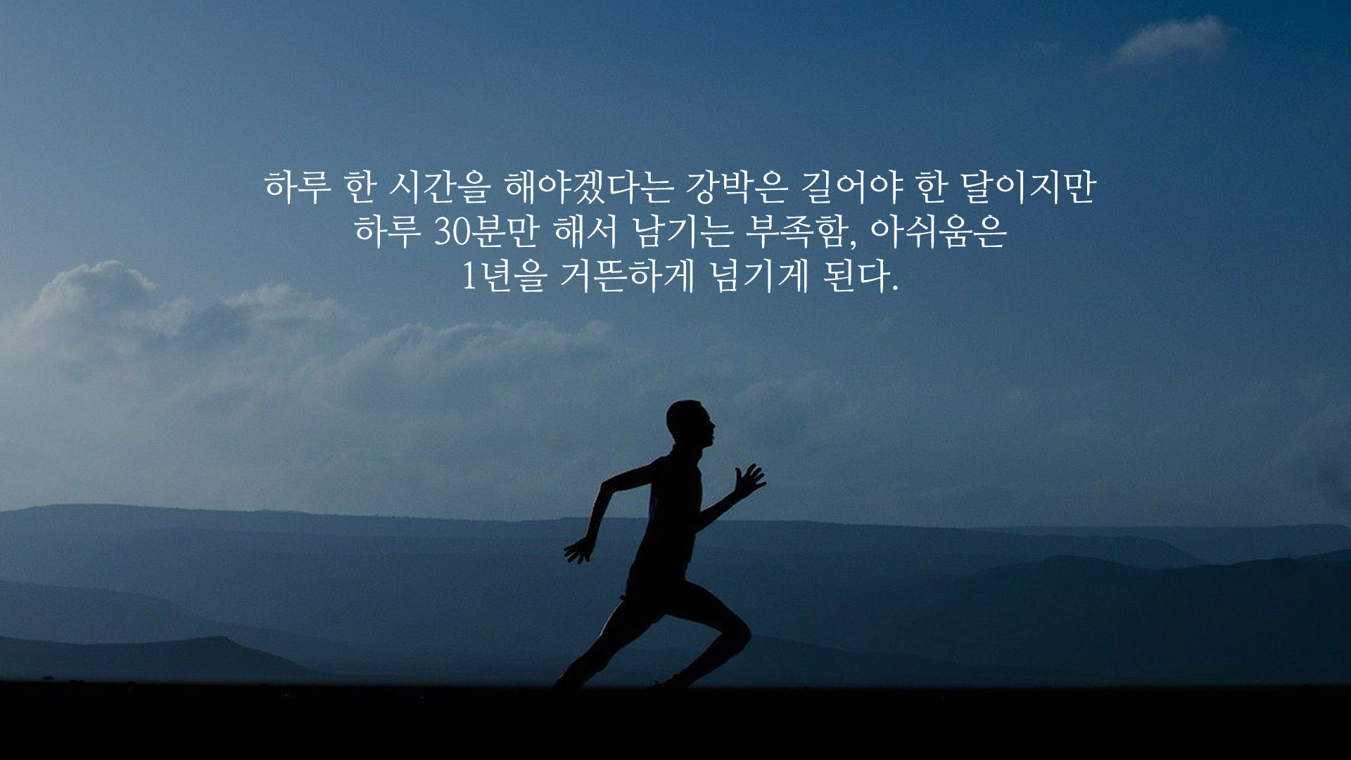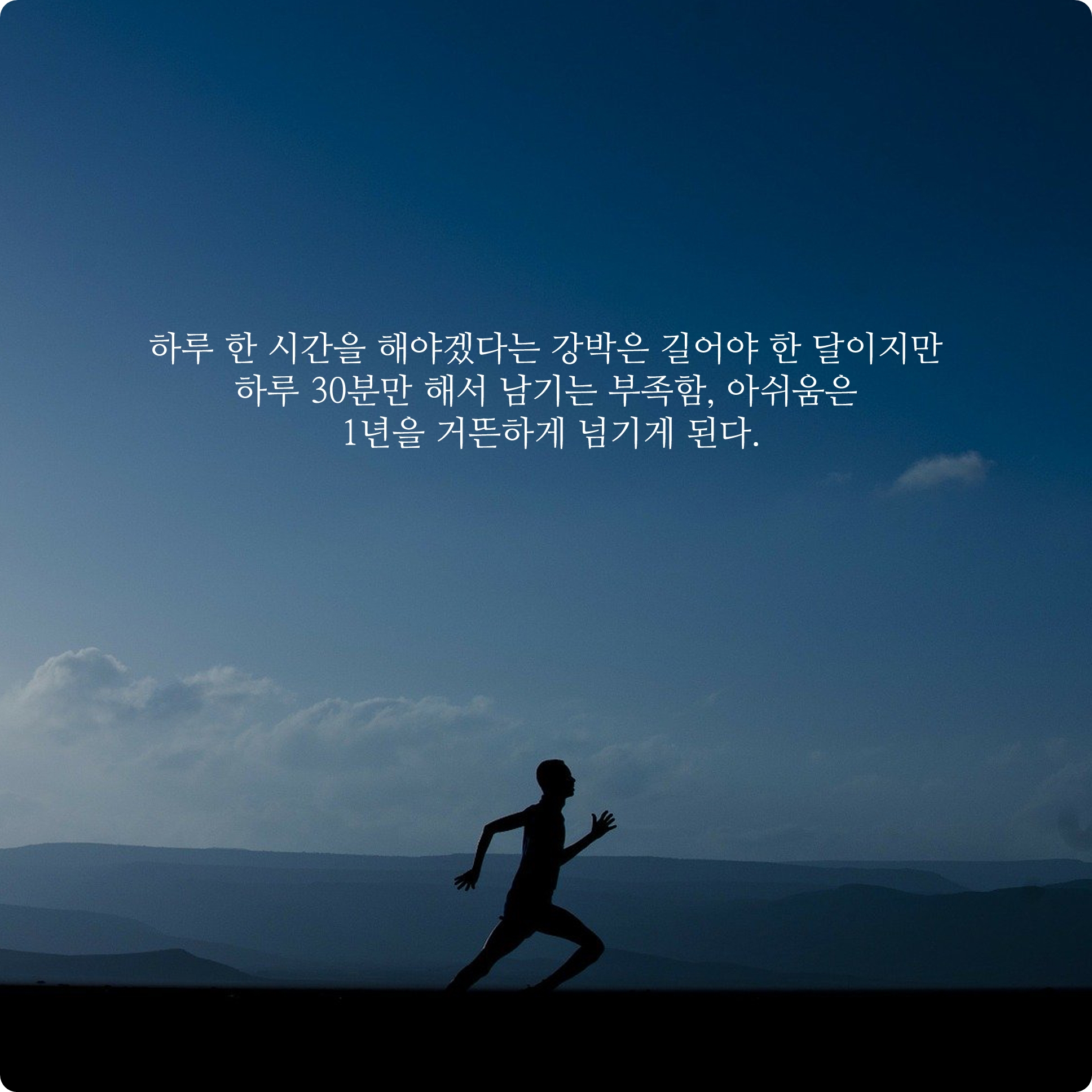 하루 한 시간을 해야겠다는 강박은 길어야 한 달이지만 하루 30분만 해서 남기는 부족함, 아쉬움은 1년을 거뜬하게 넘기게 된다.