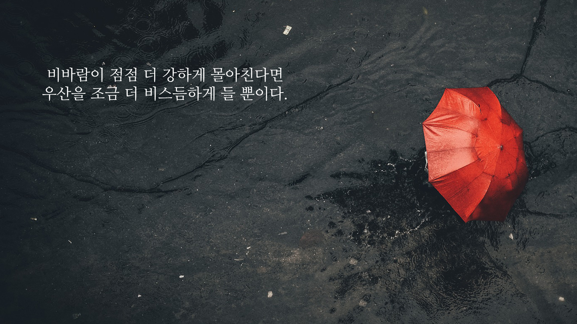 비바람이 점점 더 강하게 몰아친다면 우산을 조금 더 비스듬하게 들 뿐이다.