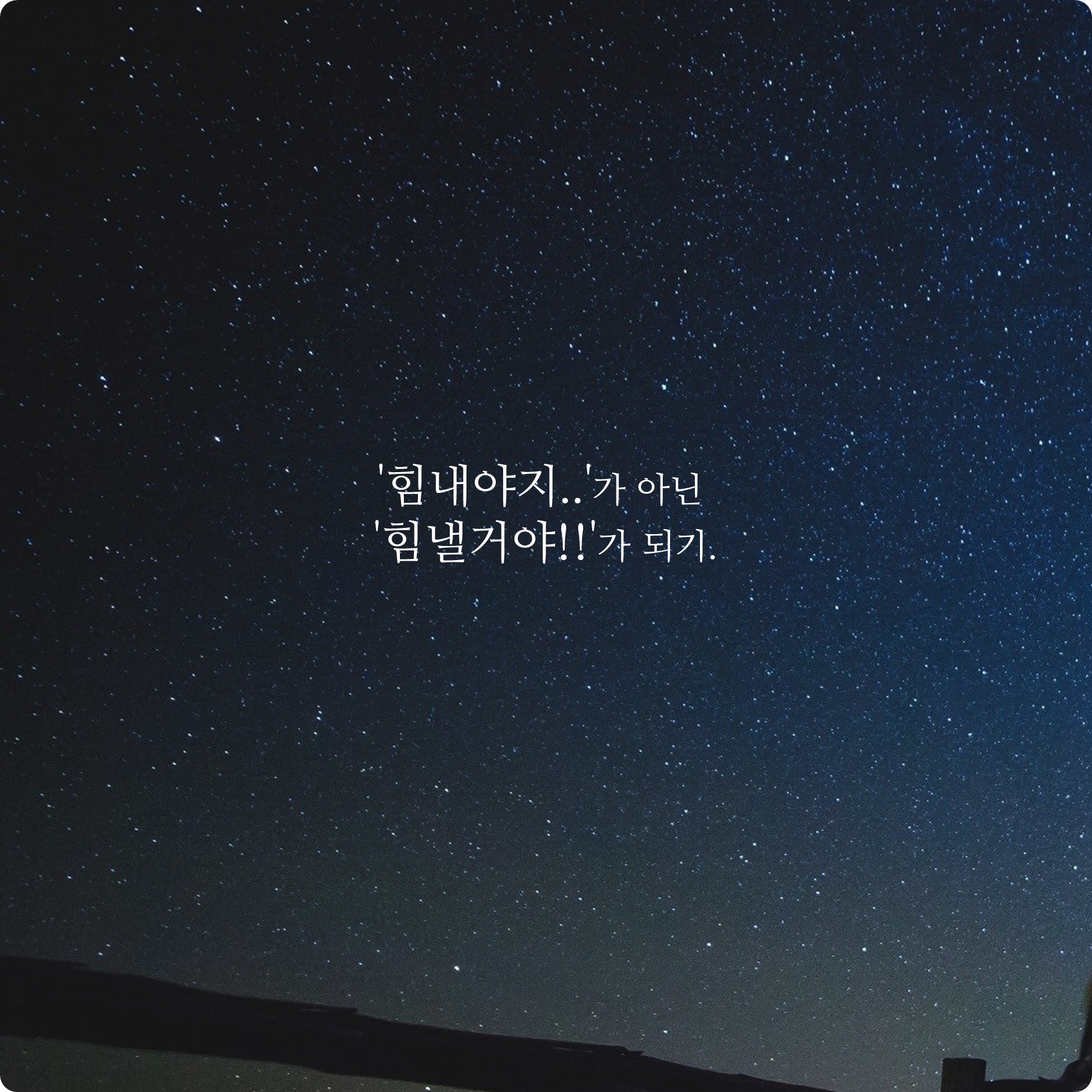무엇인가를 해야 하지만 그것이 뜻대로 잘 풀리지 않아서 지쳐 있을 때가 있습니다. 가끔은 그런 감정적으로 상황을 받아들일 때가 있죠. 그럴 때 하게 되는 다짐이 '힘내야지..'라고 억지로 없는 힘을 내게 되곤 합니다. 그런 힘없는 다짐이 아니라 조금 더 힘 있는 다짐을 하는 것은 어떨까요? 그래서 엄연히 다른 비슷한 말이지만 느낌에 따라 다른 두 가지를 대조적으로 함께 적어봤습니다.