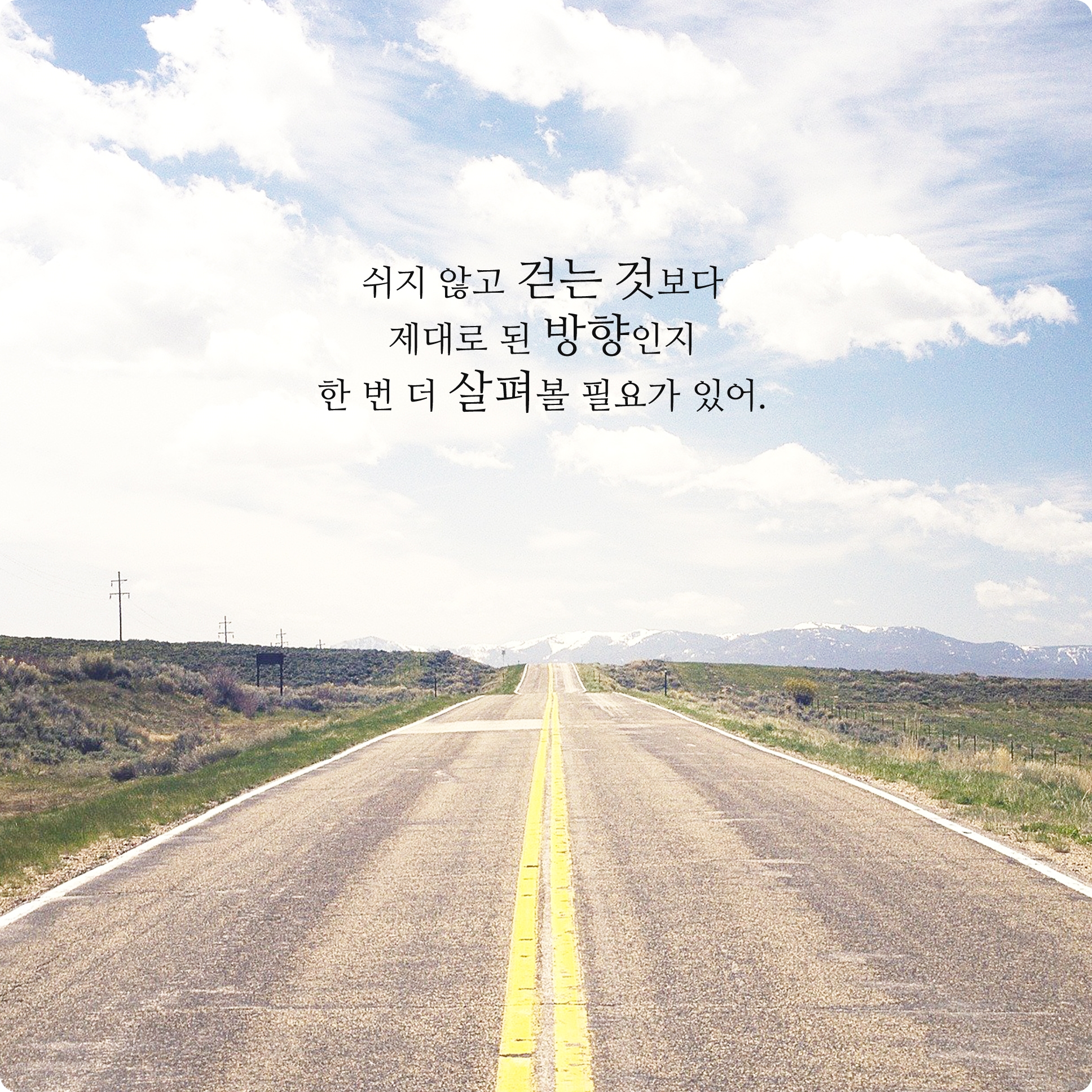 우리 사회는 '끊임없는 노력'을 강요하는 것 같습니다. 매사 열심히 해야 하고 최선을 다해야 한다고 하지만 그것보다 더 중요한 것이 내가 지금 걷고 있는 삶의 방향 또는 노력들이 제대로 된 방향을 향하고 있는지가 중요합니다. 그래서 노력을 하는 것은 좋지만 그 안에는 내 신념이 있어야 하고, 충분한 의지도 있어야 하며, 후회하지 않는 옳은 방향이 되어야 합니다. 그래서 그러한 총체를 '길'의 사진과 함께 적은 글귀입니다.