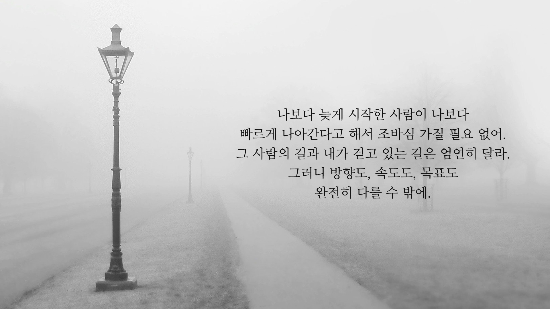 나보다 늦게 시작한 사람이 나보다 빠르게 나아간다고 해서 조바심 가질 필요 없어. 그 사람의 길과 내가 걷고 있는 길은 엄연히 달라. 그러니 방향도, 속도도, 목표도 완전히 다를 수 밖에.