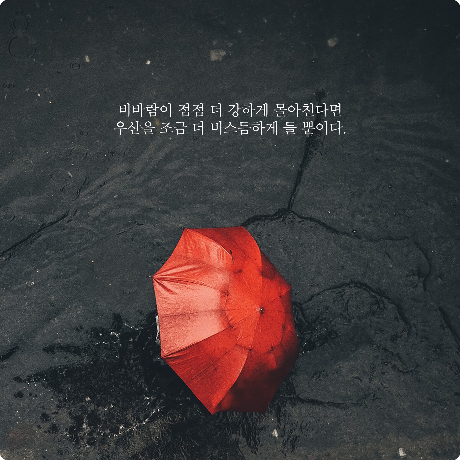 비바람이 몰아치고 있는 길을 걷고 있다면 조금 더 강하게 맞바람이 불고 더 굵은 빗줄기가 몰아치는 상황이고 더는 피할 수 없는 상황이라면 지금 당장 내가 할 수 있는 것은 우산을 비스듬하게 세워 꿋꿋하게 걸어나갈 뿐이랍니다. 지금 할 수 있는 것을 하라는 말이죠. 충분히 할 수 있음에도 안 하고 그것을 피하려고만 하기 때문에 우리는 포기를 하게 되는 것은 아닐까요? 때문에 그런 메시지를 우산(선택)과 비바람(환경)에 비유를 해봤습니다.