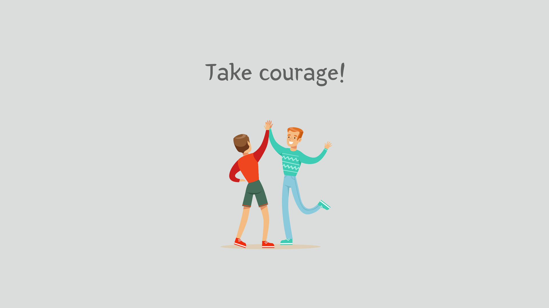 하이파이브를 하고 있는 'Take courage!' 일러스트 글귀 이미지입니다. 글귀의 뜻은 '용기를 내세요!'가 되고요. 이렇게 총 다섯 가지의 키워드를 가지고 관련된 이미지와 영어 표현들을 함께 감상을 해봤고요. 상황에 따라 조금씩 쓰임은 다르지만 모두 비슷한 맥락이 아닐까 생각이 듭니다.