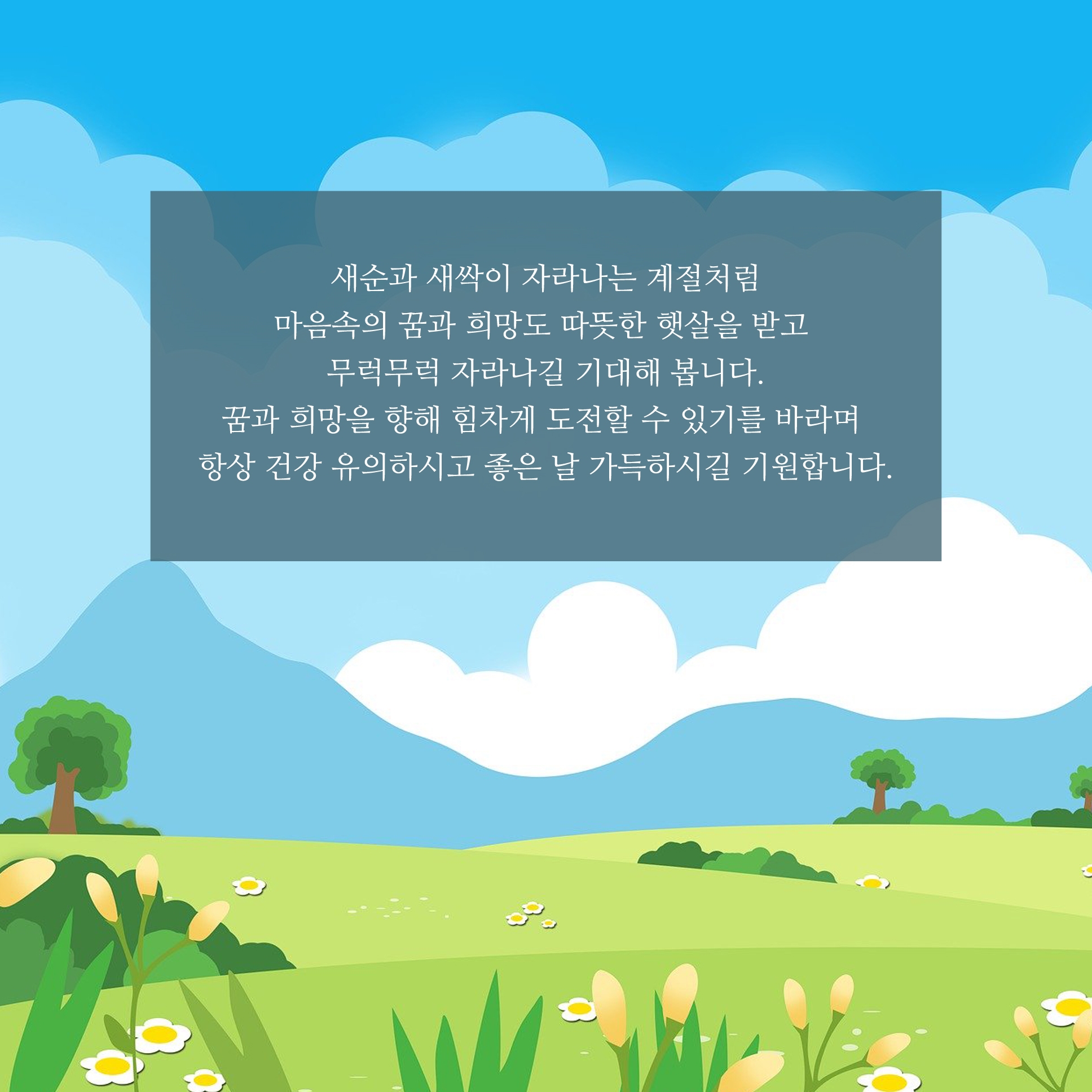 새순과 새싹이 자라나는 계절처럼 마음속의 꿈과 희망도 따뜻한 햇살을 받고 무럭무럭 자라나길 기대해 봅니다. 꿈과 희망을 향해 힘차게 도전할 수 있기를 바라며 항상 건강 유의하시고 좋은 날 가득하시길 기원합니다.