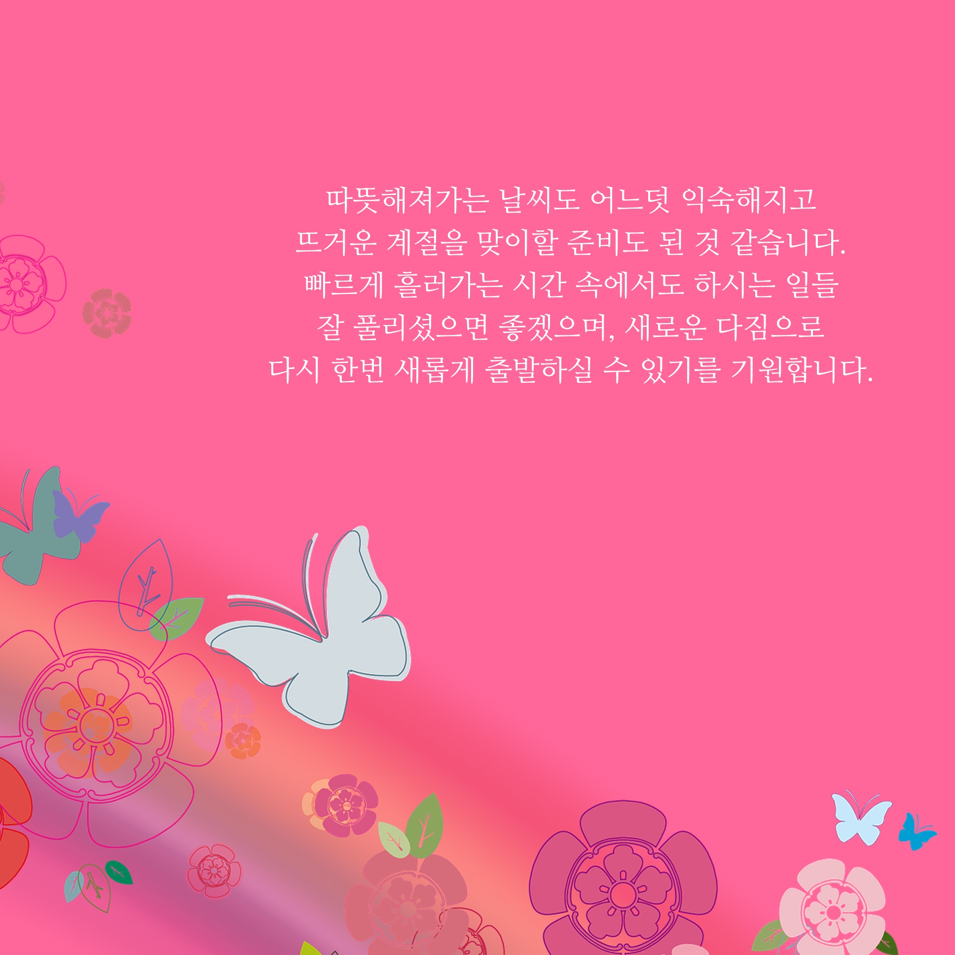 움츠렸던 계절이 지나 이제는 따뜻한 봄이 찾아왔습니다. 언제나 건강 조심하시고 즐거운 일 가득하세요.