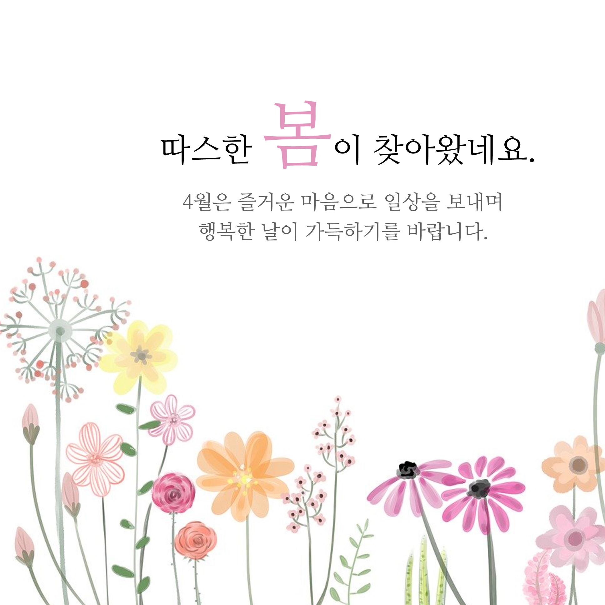 따스한 봄기운이 느껴지는 4월입니다. 언제나 건강 유의하시고 행복하시길 기원합니다.