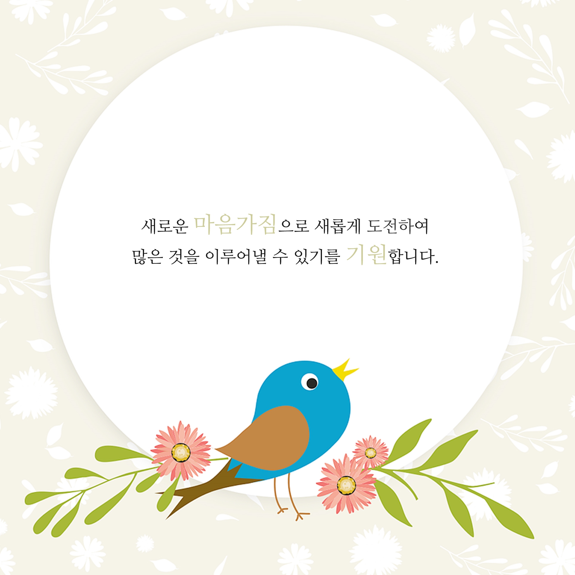 기분 좋은 봄이 찾아왔습니다. 설렘 가득한 희망과 꿈 마음껏 품으며 많은 것을 성취할 수 있는 계절이 되었으면 합니다.