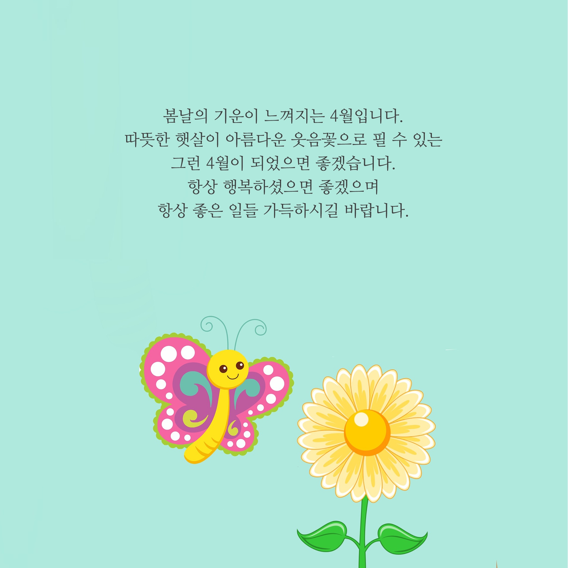봄날의 기운이 느껴지는 4월입니다. 따뜻한 햇살이 아름다운 웃음꽃으로 필 수 있는 그런 4월이 되었으면 좋겠습니다. 항상 행복하셨으면 좋겠으며 항상 좋은 일들 가득하시길 바랍니다.