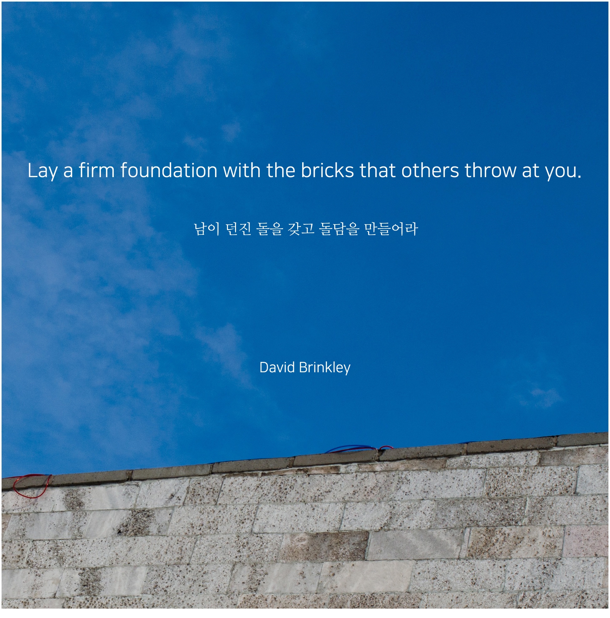 남이 던진 돌의 의미는 무엇일가요? 그 돌은 어떻게보면 의미있는 기회일 수 있지만 그 기회를 저버리는 독단적인 행동이 아닐까요? 남들에게 보여지는 것은 위기일 수 있지만 그 위기를 기회로 승화시키는 것과도 비슷한 맥락이라고 볼 수도 있구요. 또한 남들이 무심코 흘려버리는 것을 조금 더 다른관점과 시각으로 바라보는 창의력일 수도 있겠죠?
