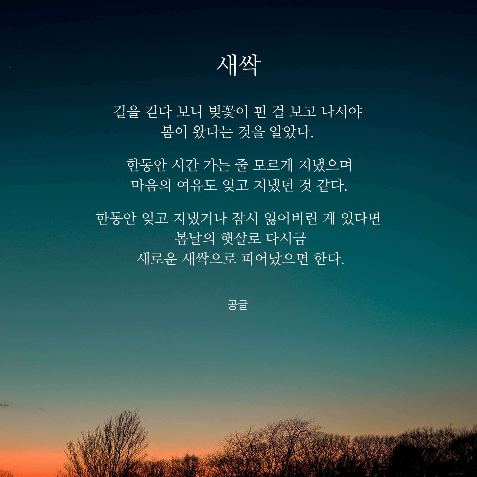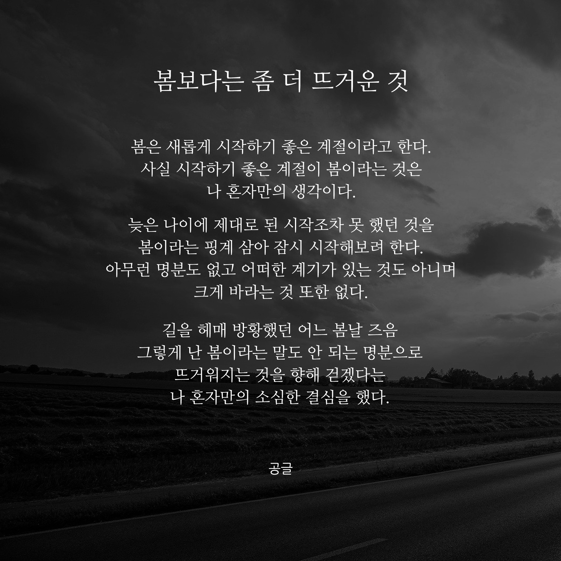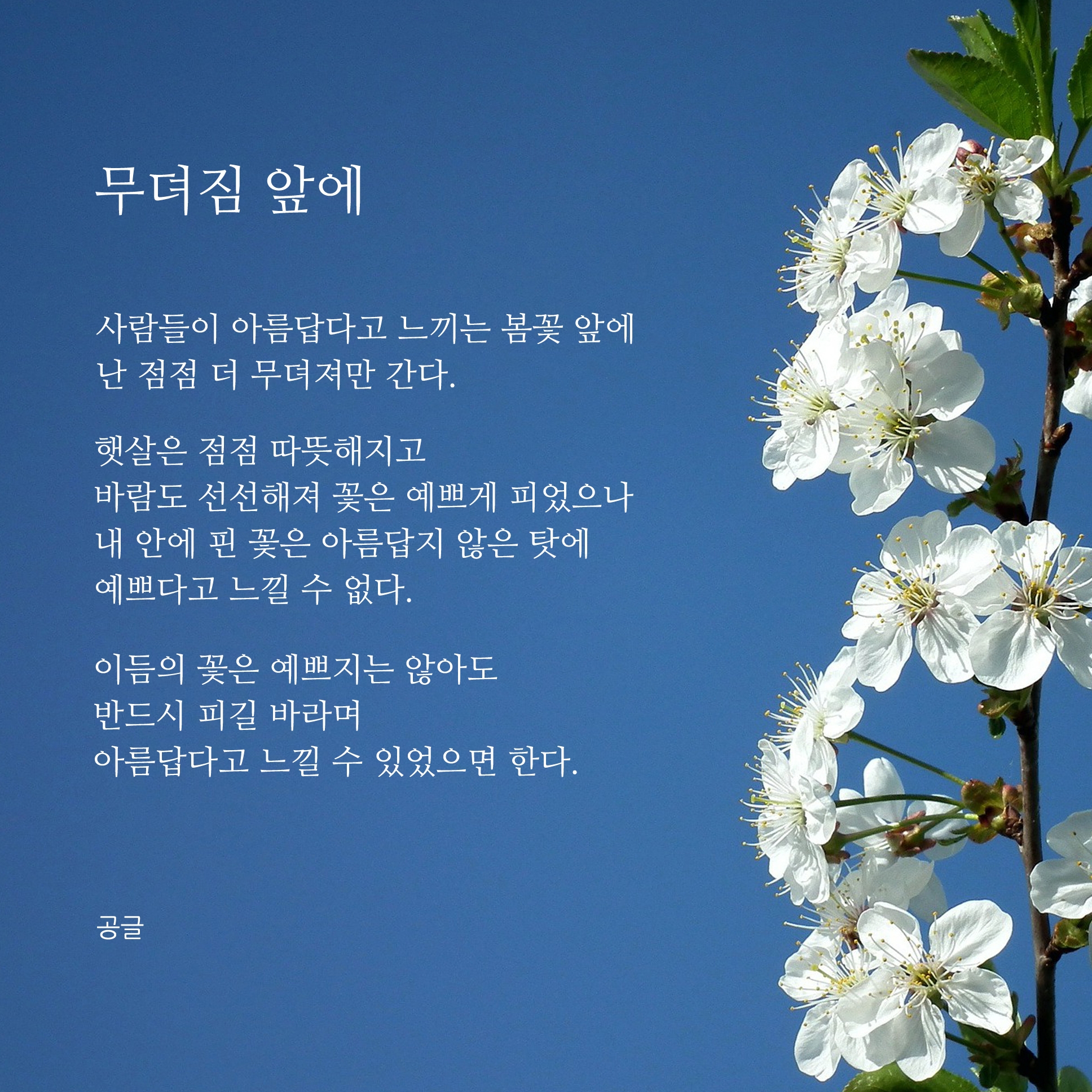 이어서 봄에 대한 시 이미지를 사이즈로 변경하여 다시 편집을 했습니다. 이제는 이런 시와 글귀와 같은 짧은 글을 쓴지도 어느덧 1년이라는 시간이 흘렀네요. 요즘 코로나 때문에 집안에 있는 시간이 많아졌지만 맨탈이 많이 흔들리고 있는 시기라서 글을 쓰기는커녕, 아무것도 하는 것 없이 시간을 보내는 경우가 많은 것 같습니다. 그래서 고민도 많고 생각이 많아지는 것 같아요. 지금 필요한 것은 나 자신이 혹사시켜 깎아 왔던 현재의 내 마음이 아닐까요? 여러분들은 저처럼 너무 생각이나 고민들에 빠지지 마시고 조금이나 힐링을 얻고 힘이 될 수 있는 전환점이 되시길 바라며 항상 응원하겠습니다.