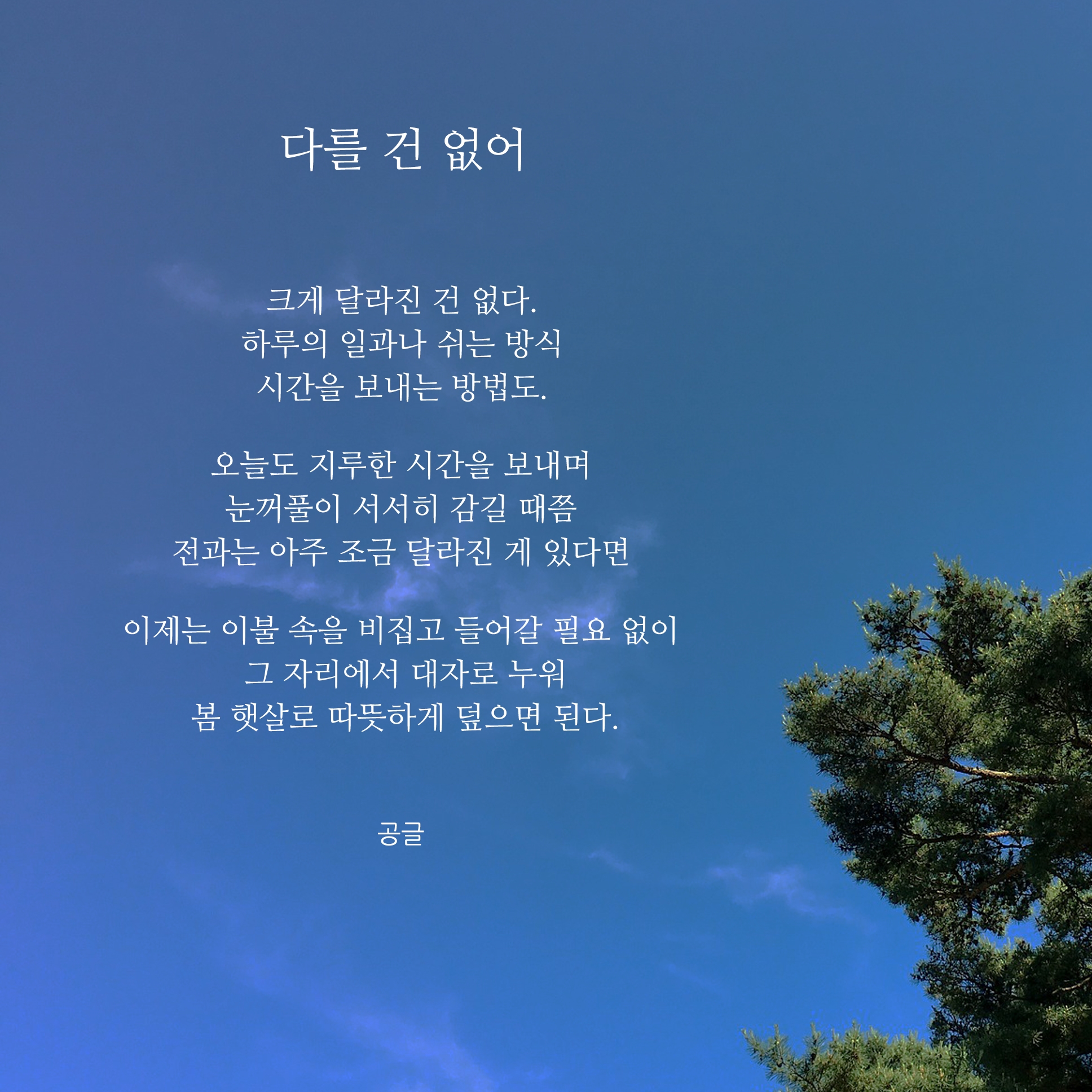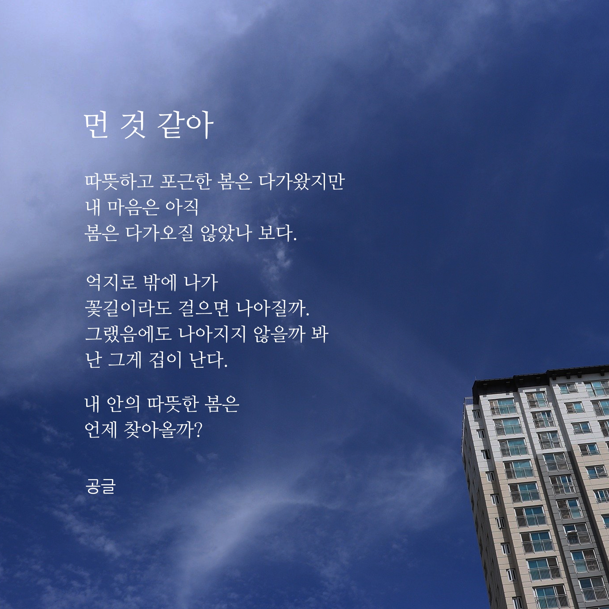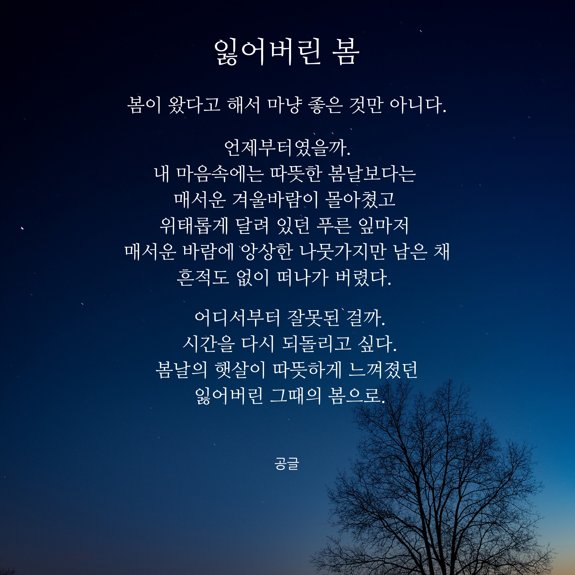 이어서 봄에 대한 시 이미지를 사이즈로 변경하여 다시 편집을 했습니다. 이제는 이런 시와 글귀와 같은 짧은 글을 쓴지도 어느덧 1년이라는 시간이 흘렀네요. 요즘 코로나 때문에 집안에 있는 시간이 많아졌지만 맨탈이 많이 흔들리고 있는 시기라서 글을 쓰기는커녕, 아무것도 하는 것 없이 시간을 보내는 경우가 많은 것 같습니다. 그래서 고민도 많고 생각이 많아지는 것 같아요. 지금 필요한 것은 나 자신이 혹사시켜 깎아 왔던 현재의 내 마음이 아닐까요? 여러분들은 저처럼 너무 생각이나 고민들에 빠지지 마시고 조금이나 힐링을 얻고 힘이 될 수 있는 전환점이 되시길 바라며 항상 응원하겠습니다.