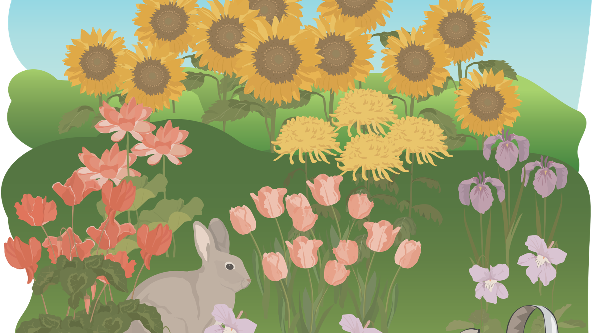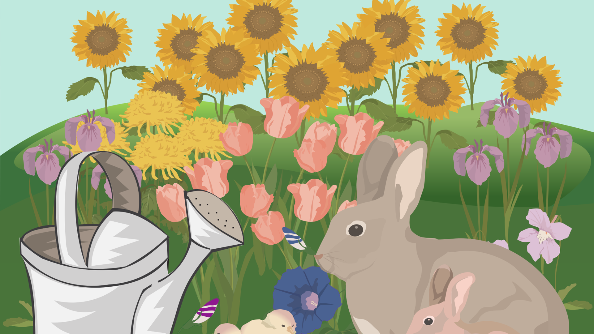 토끼와 물조루가 있고 그 뒤로는 여러 가지 꽃들이 예쁘게 피었네요.