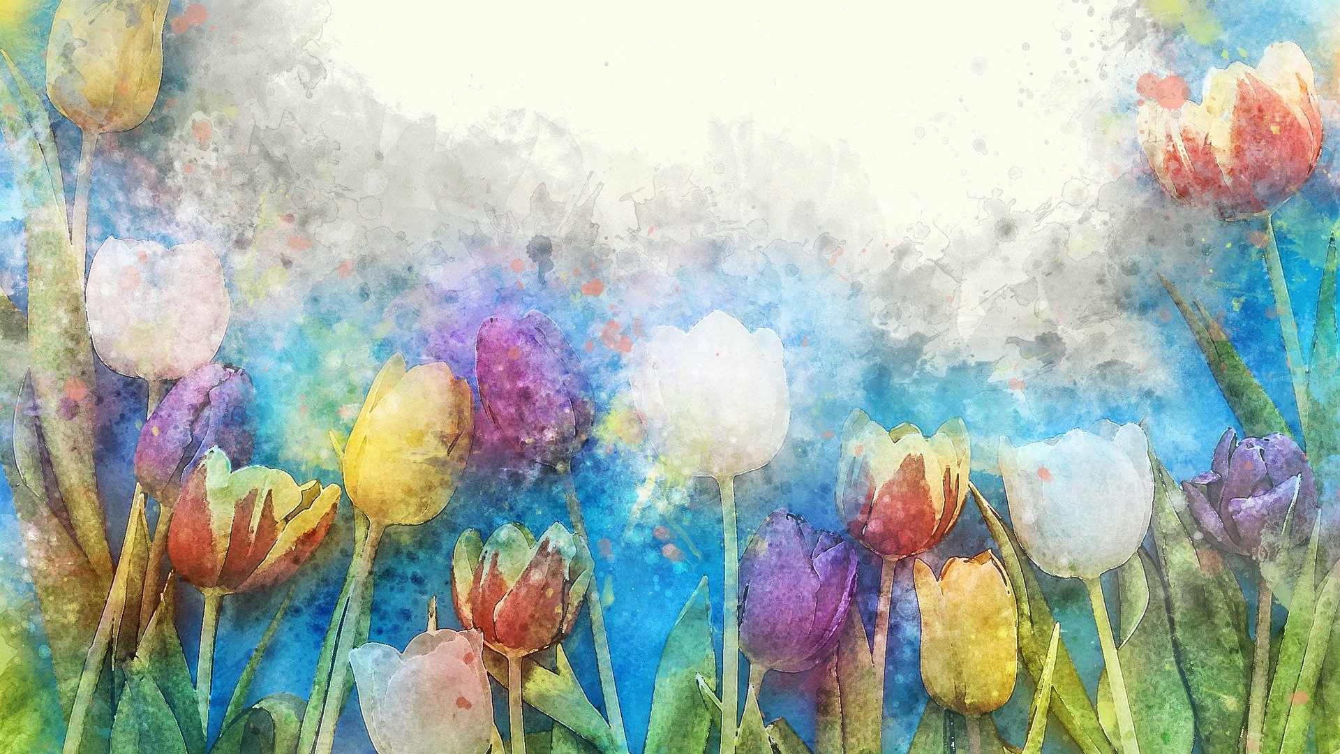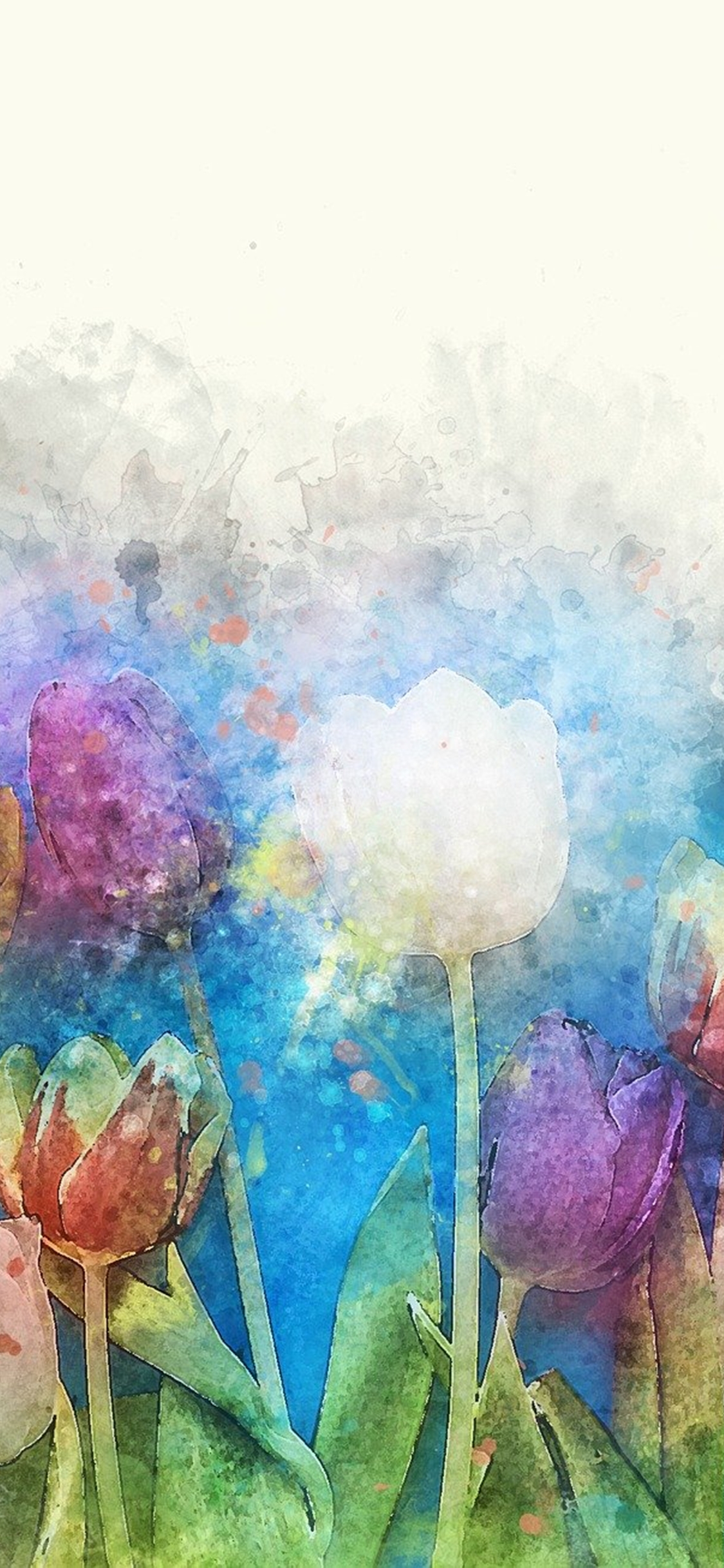 튤립으로 보이는 꽃이 수채화 같은 느낌을 연상하게 하네요.