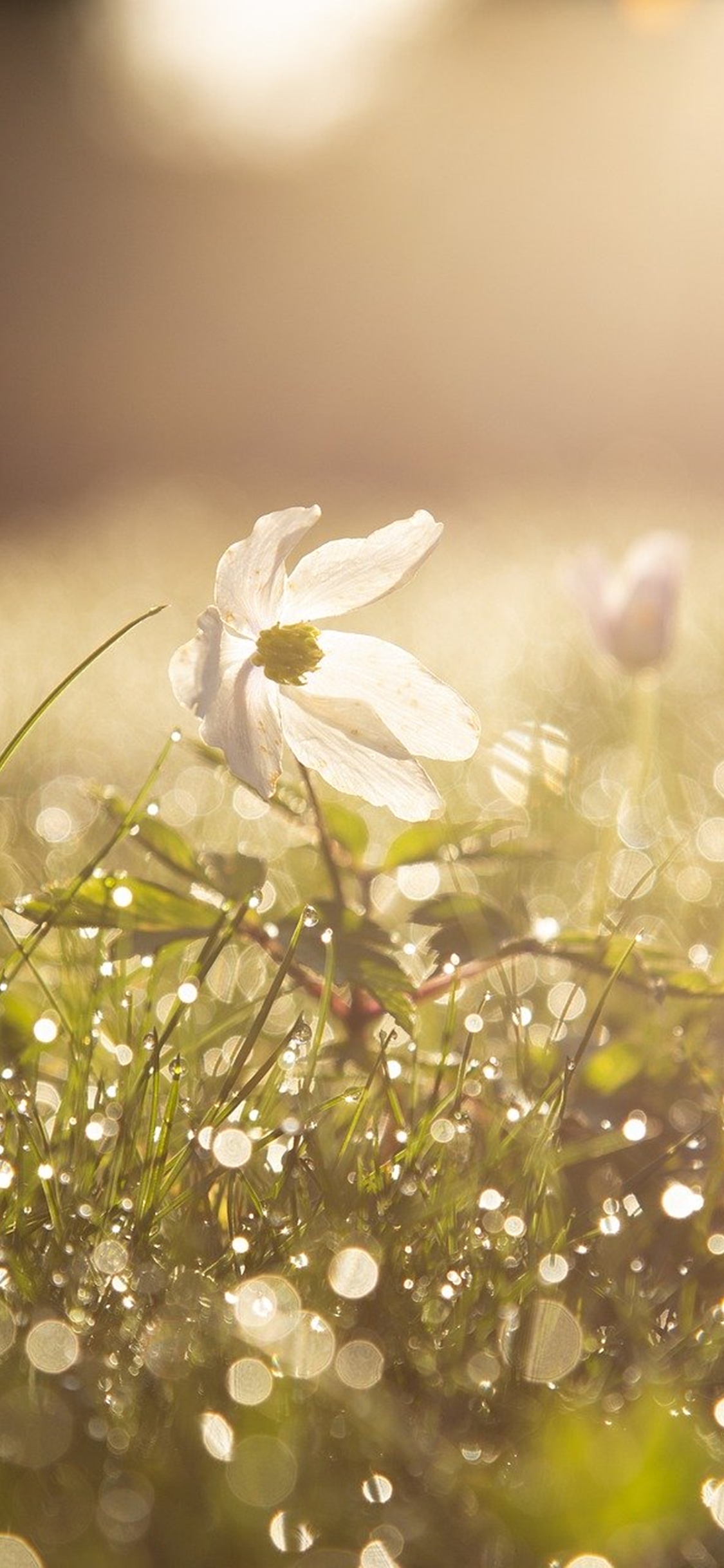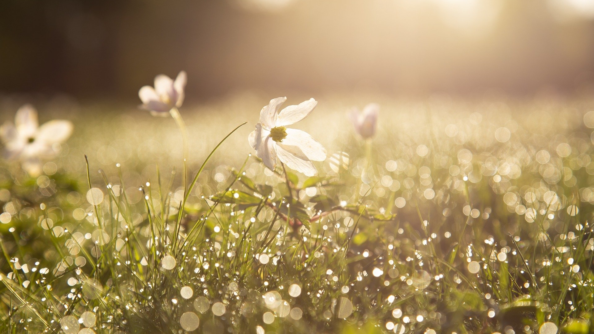 그런 포근함이 조금 더 분위기 있게 담은 사진이고요. 햇살이 눈부시게 내리쬐고 있는 이슬을 머금은 풀 위로 꽃이 핀 모습입니다.