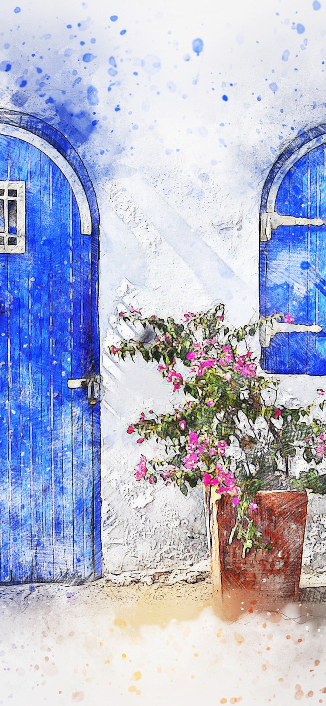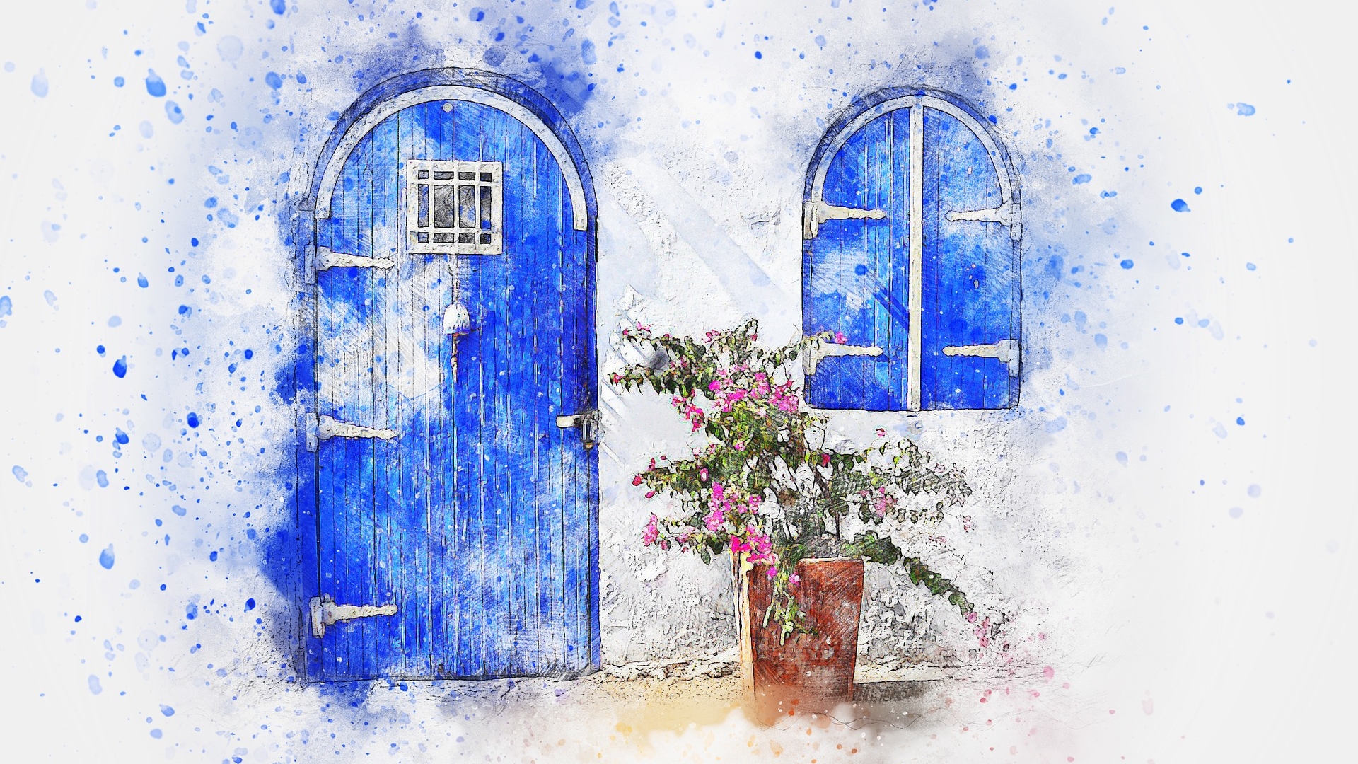 이번에는 이런 일러스트 느낌의 봄 이미지는 어떠세요? 물감이 튀긴 것 같은 수채화 느낌의 이미지인데요. 벽에 파란색 나무 문과 창문 그리고 그 앞에 화분이 놓여 있는 모습이 참 분위기있는 느낌을 전해줍니다.