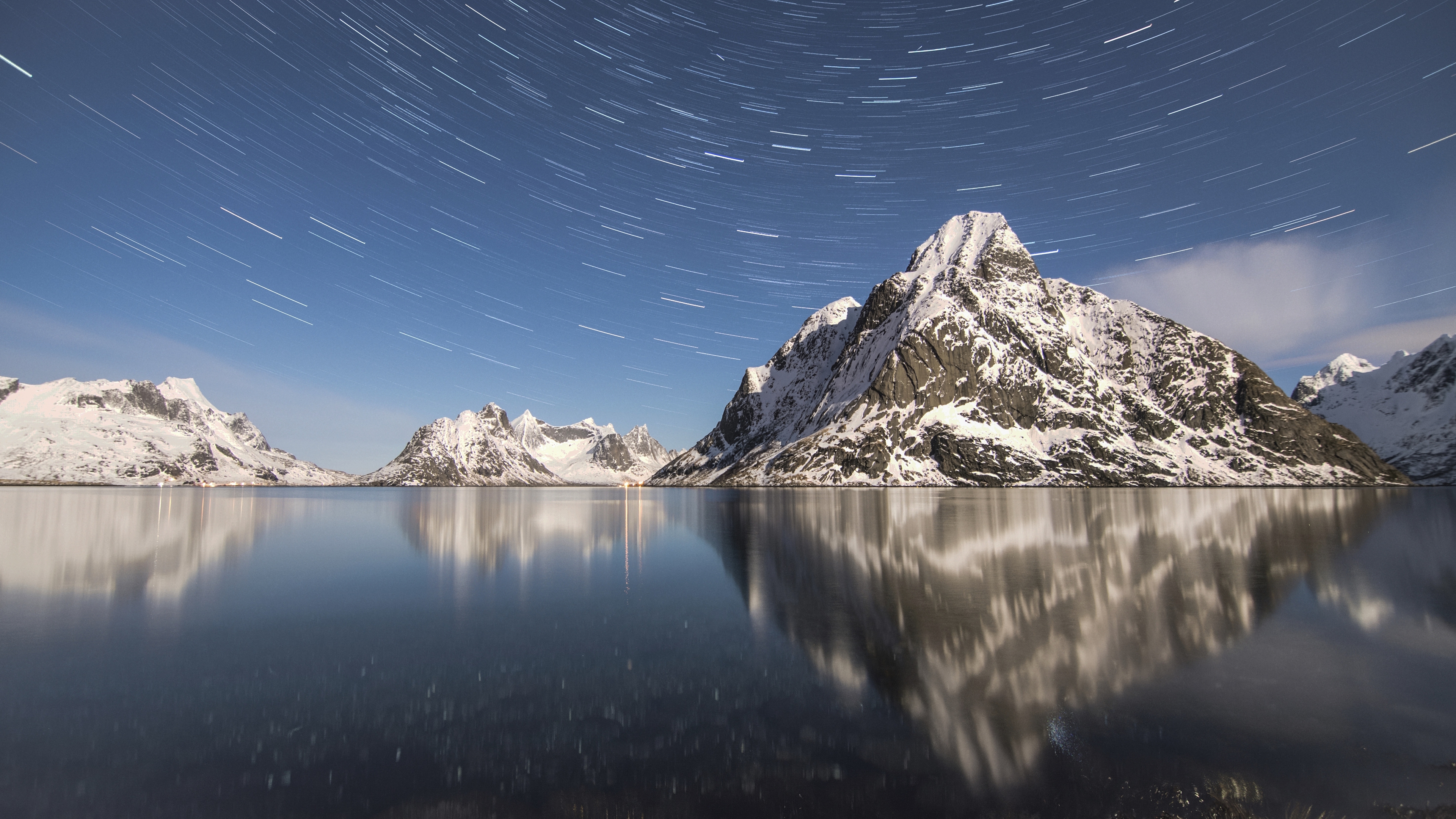 흘러가는 시간 또는 빠르게 지나가는 시간 경과를 나타내는 움직이는 별의 모습을 사진으로 담은 호숫가의 사진입니다.