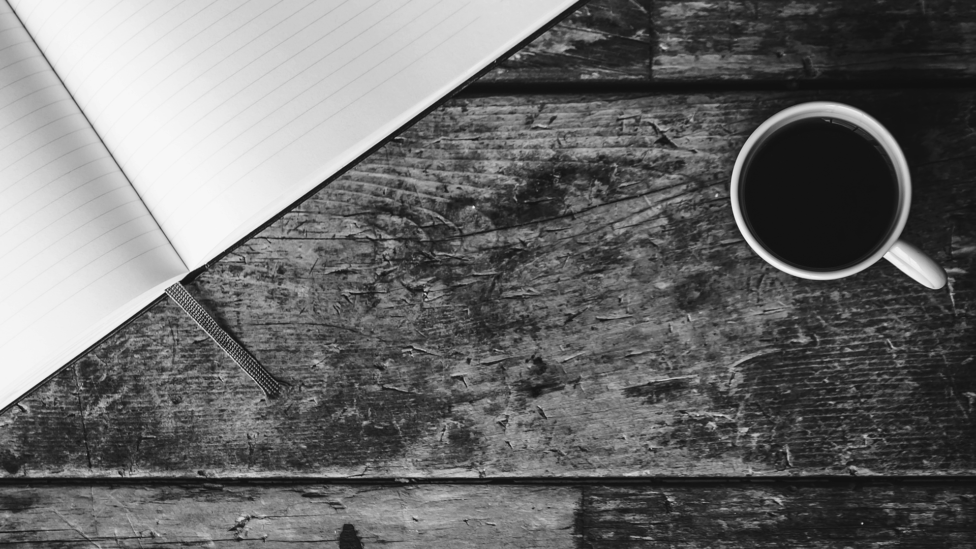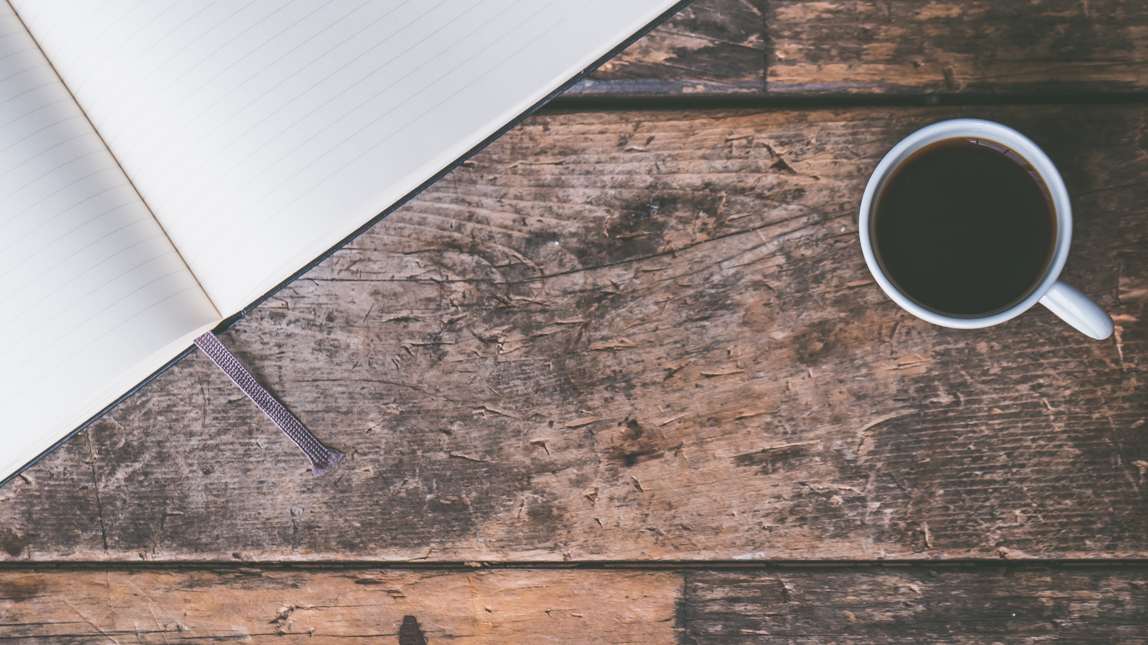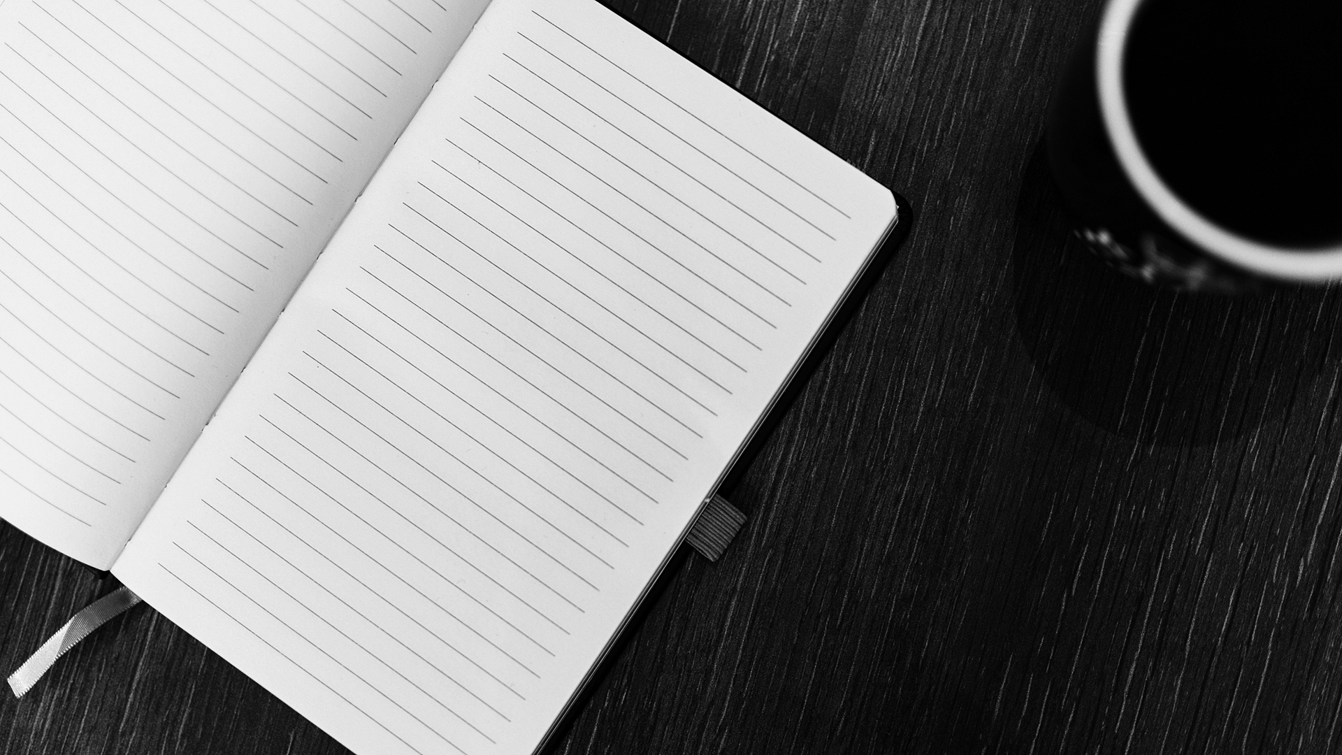 선이 그려진 수첩과 같이 생긴 다이어리 그리고 오른쪽에는 아메리카노 커피가 보이고 오른쪽 하단 쪽에 여백의 공간이 있네요.
