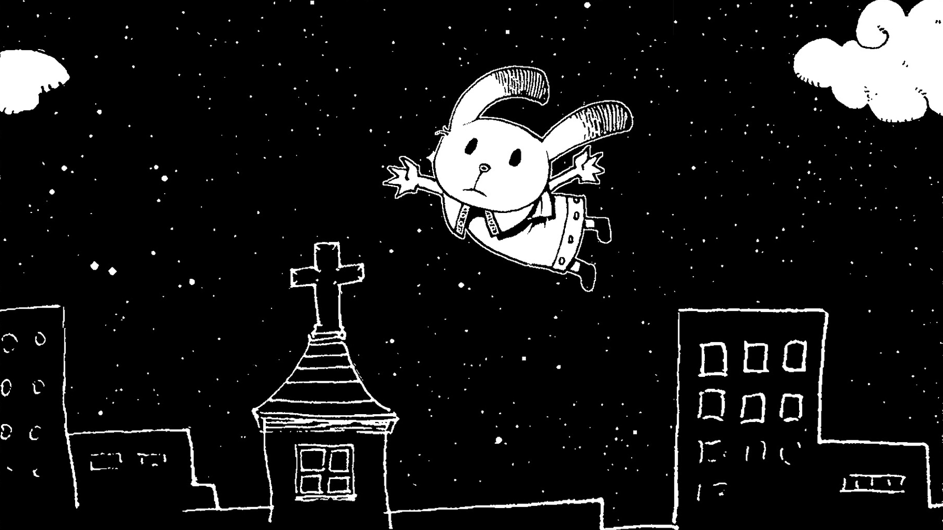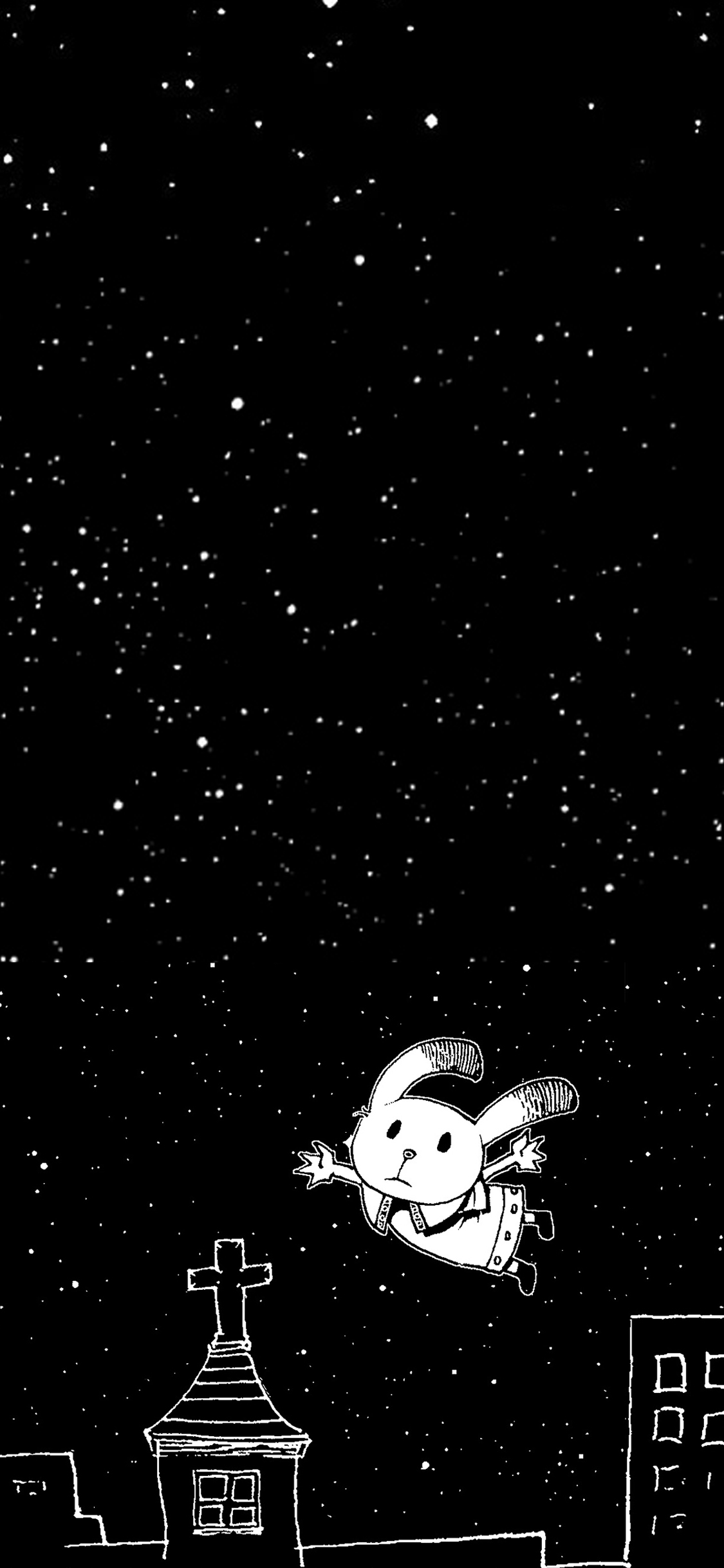 나무가 보이는 밤 하늘에 자유로이 날고 있는 토끼.. 그리고 그 앞에는 생선도 한 마리 같이 날고 있네요. 마치 어디에선가 순간 이동을 할 때나 타임머신을 타고 이동을 할 때 주변 것들도 같이 이동이 되는 경우가 있는데 이렇게 순간 이동을 하면서 주변에 있던 생선 한 마리도 같이 이동이 된 것 같네요.