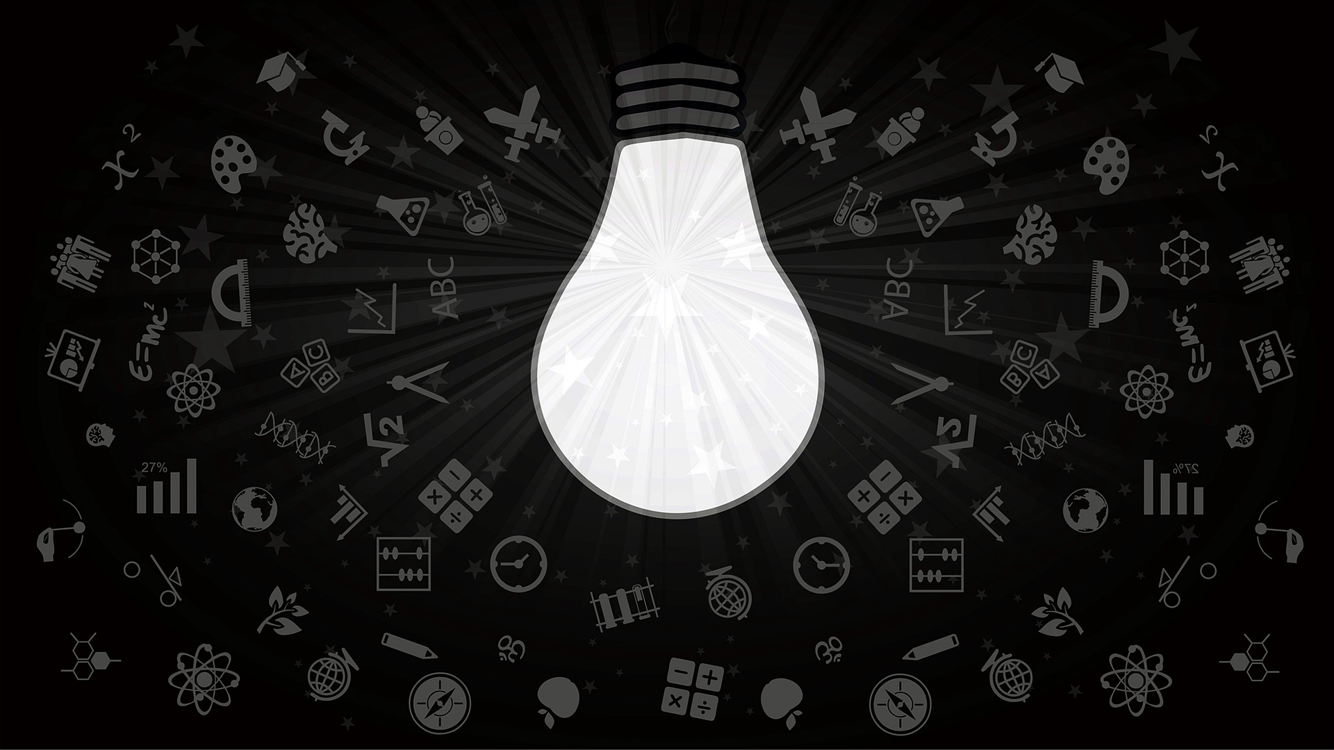 아이디어, 상상력, 창의력과 같은 우리 생각을 상징할 수 있는 이미지입니다. 전구를 가운데 그리고 주변에는 차트나 그래프, 나침반, 캔버스와 같은 여러 도형들을 배경으로 하고 있는 일러스트입니다.