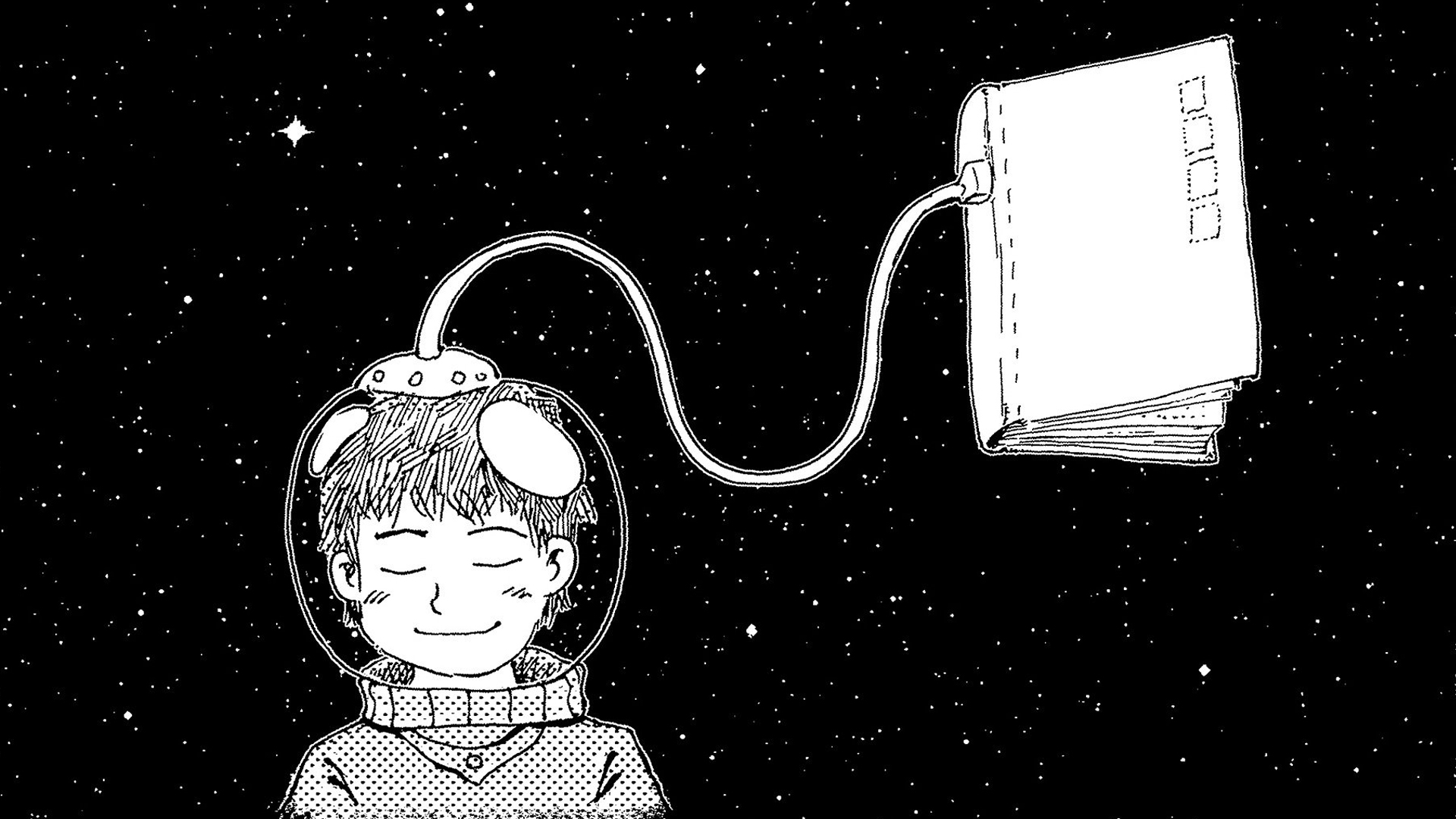 우주복을 착용한 소년이 책에 있는 정보를 담고 있는 듯한 독특한 느낌의 이미지입니다. 미래에는 이렇게 책이나 서적에 정보들을 아주 쉽게 우리 뇌 속으로 옮길 수 있게 되지 않을까요?